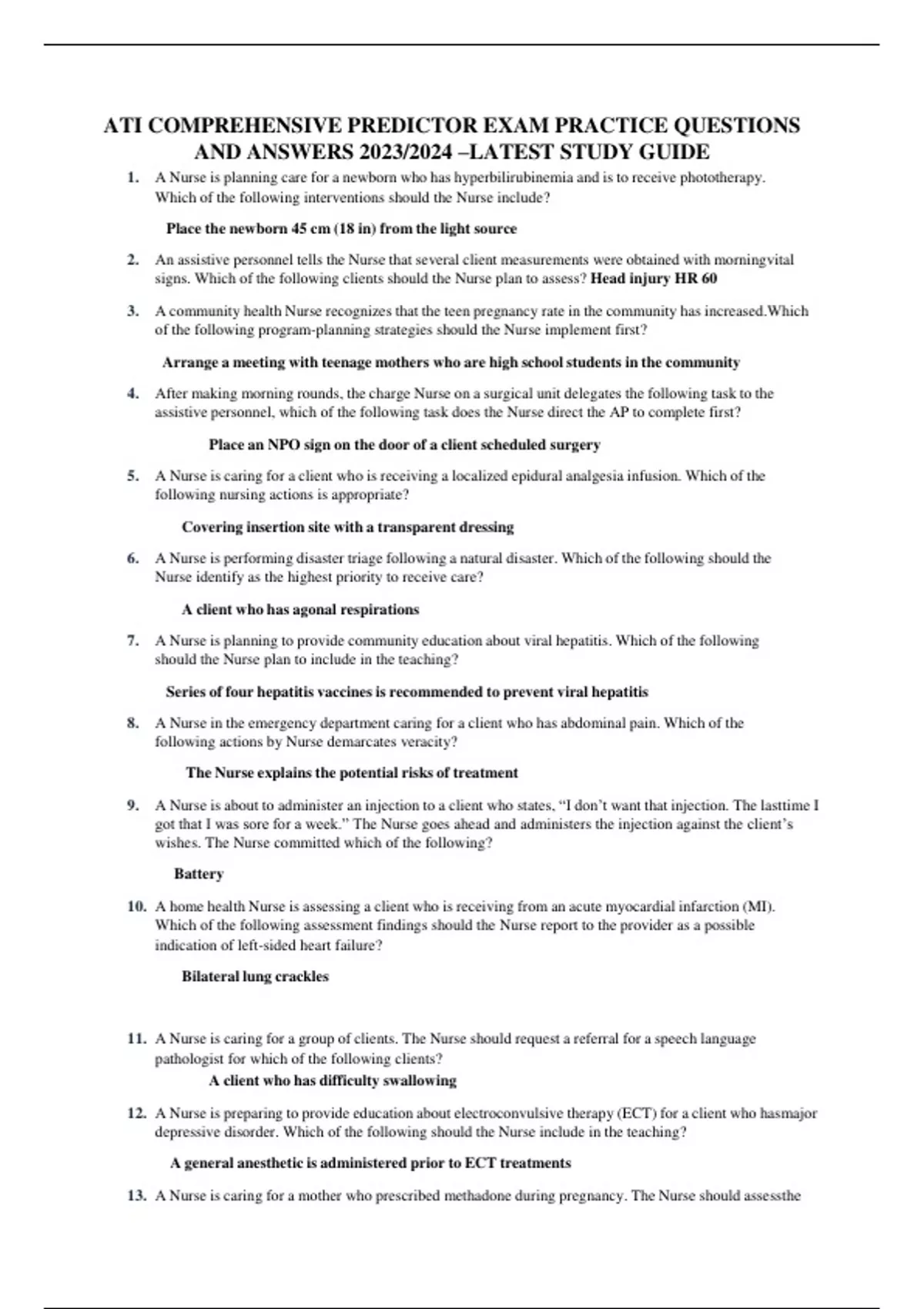 ATI COMPREHENSIVE PREDICTOR EXAM PRACTICE QUESTIONS AND ANSWERS 2023/2024 –LATEST STUDY GUIDE