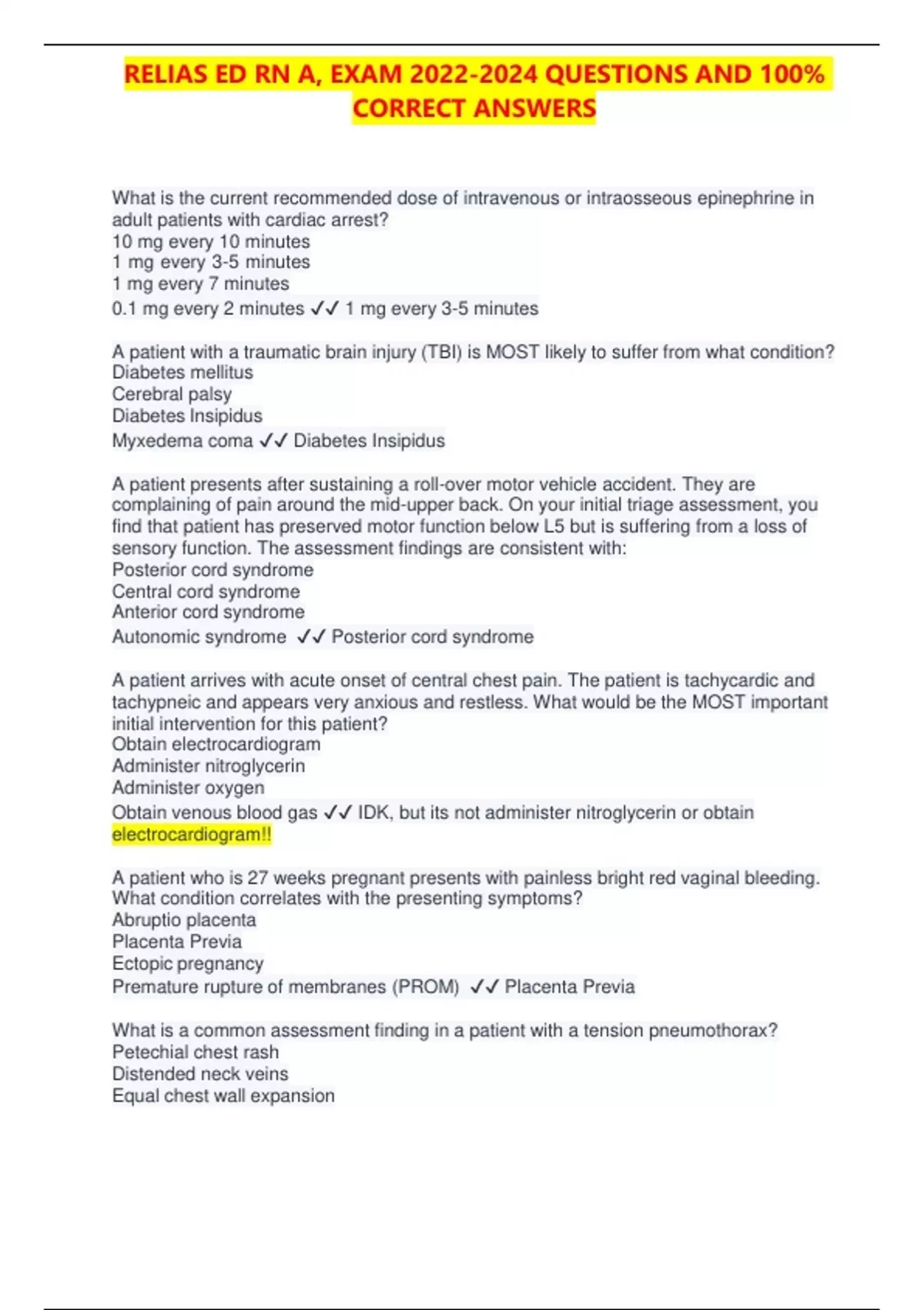 RELIAS ED RN A, EXAM QUESTIONS AND 100% CORRECT ANSWERS What is the current recommended dose of intravenous or intraosseous epinephrine in adult patients with cardiac arrest? 10 mg every 10 minutes 1 mg every 3-5 minutes 1 mg every 7 minutes 0.1 mg every 2 minutes 1 mg every 3-5 minutes A patient with a traumatic brain injury (TBI) is MOST likely to suffer from what condition? Diabetes mellitus Cerebral palsy Diabetes Insipidus Myxedema coma Diabetes Insipidus A patient presents after sustaining a roll-over motor vehicle accident. They are complaining of pain around the mid-upper back. On your initial triage assessment, you find that patient has preserved motor function below L5 but is suffering from a loss of sensory function. The assessment findings are consistent with: Posterior cord syndrome Central cord syndrome Anterior cord syndrome Autonomic syndrome Posterior cord syndrome A patient arrives with acute onset of central chest pain. The patient is tachycardic and tachypneic and appears very anxious and restless. What would be the MOST important initial intervention for this patient? Obtain electrocardiogram Administer nitroglycerin Administer oxygen Obtain venous blood gas IDK, but its not administer nitroglycerin or obtain electrocardiogram!! A patient who is 27 weeks pregnant presents with painless bright red vaginal bleeding. What condition correlates with the presenting symptoms? Abruptio placenta Placenta Previa Ectopic pregnancy Premature rupture of membranes (PROM) Placenta Previa What is a common assessment finding in a patient with a tension pneumothorax? Petechial chest rash Distended neck veins Equal chest wall expansion RELIAS ED RN A, EXAM QUESTIONS AND 100% CORRECT ANSWERS Flattened neck veins Distended Neck Veins A patient presents with a two-day history of fever, cough, mild shortness of breath (SOB), sore throat, myalgia, and new onset of loss of taste and smell. What is the patient MOST likely suffering from? Giardia Microsporidia COVID 19 Tuberculosis COVID 19 The deficiency of anti-diuretic hormone (ADH) can lead to what endocrine disorders? Diabetes Insipidus Diabetes Mellitus Adrenal Insufficiency Syndrome of inappropriate secretion of ADH (SIADH) Diabetes Insipidus A patient presents after an intentional overdose of propranolol approximately 2 hours ago. The patient has severe hypotension and bradycardia. IV fluids and vasopressors are initiated. What nursing assessment findings indicate the treatment has been effective? Decreasing pulse pressure Decreasing central venous pressure Increasing serum glucose Increasing serum cortisol Increasing serum glucose A patient presents with acute onset of chest pain and goes into cardiac arrest immediately upon arrival. What is a possible reversible cause of cardiac arrest? Hypervolemia Alkalosis Hyperthermia Tension Pneumothorax Tension Pneumothorax Which of the following represent categories utilized to triage patients during a mass casualty incident (MCI)? Green, orange, black, purple Green, blue, red, black Red, black, pink, yellow Green, yellow, red, black Green, yellow, red, black A 22-year old female who is 8 weeks pregnant presents with a sudden onset of left lower abdominal pain and vaginal bleeding. The patient's family member stated that she had a syncopal episode shortly after that. What is the MOST likely diagnosis for her? Ruptured appendix Placenta previa