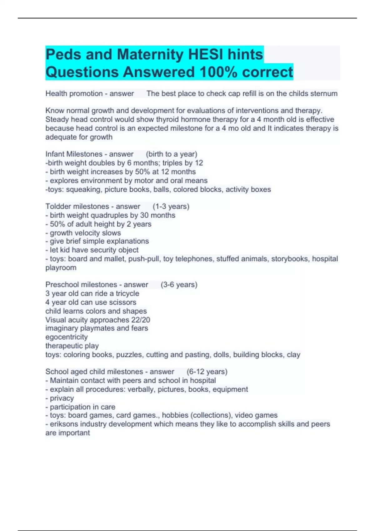 Peds and Maternity HESI hints Questions Answered 100% correct Health promotion The best place to check cap refill is on the childs sternum Know normal growth and development for evaluations of interventions and therapy. Steady head control would show thyroid hormone therapy for a 4 month old is effective because head control is an expected milestone for a 4 mo old and It indicates therapy is adequate for growth Infant Milestones (birth to a year) -birth weight doubles by 6 months; triples by 12 - birth weight increases by 50% at 12 months - explores environment by motor and oral means -toys: squeaking, picture books, balls, colored blocks, activity boxes Toldder milestones (1-3 years) - birth weight quadruples by 30 months - 50% of adult height by 2 years - growth velocity slows - give brief simple explanations - let kid have security object - toys: board and mallet, push-pull, toy telephones, stuffed animals, storybooks, hospital playroom Preschool milestones (3-6 years) 3 year old can ride a tricycle 4 year old can use scissors child learns colors and shapes Visual acuity approaches 22/20 imaginary playmates and fears egocentricity therapeutic play toys: coloring books, puzzles, cutting and pasting, dolls, building blocks, clay School aged child milestones (6-12 years) - Maintain contact with peers and school in hospital - explain all procedures: verbally, pictures, books, equipment - privacy - participation in care - toys: board games, card games., hobbies (collections), video games - eriksons industry development which means they like to accomplish skills and peers are important Tanner stages of development - Girls: breast, rapid increase of height and weight, pubic and axillary hair, menstruation, abrupt deceleration of linear growth -Boys: enlargement of testicles, pubic and axillary hair, facial hair, rapid increase in height, changes in voice, nocturnal emissions, abrupt deceleration of linear growth Adolescent Milestones (12-19 years) - adult-like thinking at 15 (abstract and problem solving) -Eriskons identity phase - maintain contact with peers and school - share room with another teen -hospitalization can effect teens body image - direct talking to teen, teach without parents - help maintain identity with own clothes, posters) - focus on here and now "how will It effect me today" - accident prevention is major to prevent death Review of age groups - Birth doubles in length by 4 years - head control at 4 months - Child can sit unsupported by 8 months - child achieves 50% adult height by 2 years - Child can throw a ball overhand by 18 months - Child can speak two-three word sentences by 2 years - Child can tie shoes at 5 years - Girls growth spurt happens before boys (10 years) - Temper tantrums are common in toddlers/ normal -adolescent gets rebellion towards parents and family values Age concepts of injury - Infant: after 6 months they can remember pain - Toddlers: fear intrusive procedures - Preschoolers: fear body mutilation - School age: fear loss of control of bodies - Adolescent: body image concerns Diseases -German measles should be screened for to prevent harm to child in pregnancy - DTaP be aware of history of seizures, neuro symptoms after vaccine, allergic reactions - MMR: (measles, mumps, and rubella) history of anaphylactic reactions to eggs or neomycin - Common cold is not a contraindication for vaccines - temp 102/ 38.8; irritable, redness, soreness at injection site for 2-3 days are all normal for DTaP and IPV (polio) - Call provider if seizures, high fever or high pitched cry - Warm washcloth on thigh injection site and "bicycling" the legs with each diaper change decreases soreness - Acetaminophen is administered orally every 4-6 hours - Pertussis fatalities are high in non immunized kids Diarrhea Make sure child does not have otitis media when taking temp in the ear Add potassium to IV fluids only when client has adequate urine output IV isotonic fluids are used (lactated ringers or normal saline fluid bolus of 20 mL/kg Urinary output for kids should be 1-2mL/kg/hr specific gravity should be less than 1.025 Poisonings Syrup of ipeac is not used; do not induce vomiting if kid is poisoned because It can cause more damage common house poisonings: perfume, alc, sunburn products, cigs, mouthwash Chelating agents (for lead poisoning) should not be used in kids with allergy to peanuts; when giving monitor CBC and renal functioning More lead is absorbed on empty stomach; only use cold water because hot water contains more lead Name two contraindications to live virus vaccines immunocompromised child and child who lives with someone who is immunocompromised list three classic signs and symptoms of measles photophobia confluent rash that begins on the face and spreads downward Koplik spots on the buccal mucosa List the signs and symptoms of iron deficiency anemia; pale conjunctive; pale skin; atrophy of papillae on tongue; brittle, ridged, or spoon-shaped nails; and thyroid edema identify food sources of vitamin A liver, sweet potatoes, carrots, spinach, peaches, apricots what disease occurs with vitamin C deficiency? Scurvy What measurements reflect present nutritional status? Weight, skinfold thickness, arm circumference List the signs and symptoms of dehydration in an infant Poor skin turgor, absence of tears, dry mucous membranes, weight loss, depressed fontanel, decreased urine list the laboratory findings that can be expected in a dehydrated child low bicarbinate, decreased pH, loss of sodium (hyponatremia), hypokalemia, elevated hct and BUN How should burns in children be assessed? By using the Lund-Browder chart, which takes into account the changing proportions of the child's body How can the nurse best evaluate the adequacy of fluid replacement in children? Monitoring urine output How should a parent be instructed to childproof a house? Lock all cabinets with toxic household items in them, examine the house from childs POV What interventions should the nurse