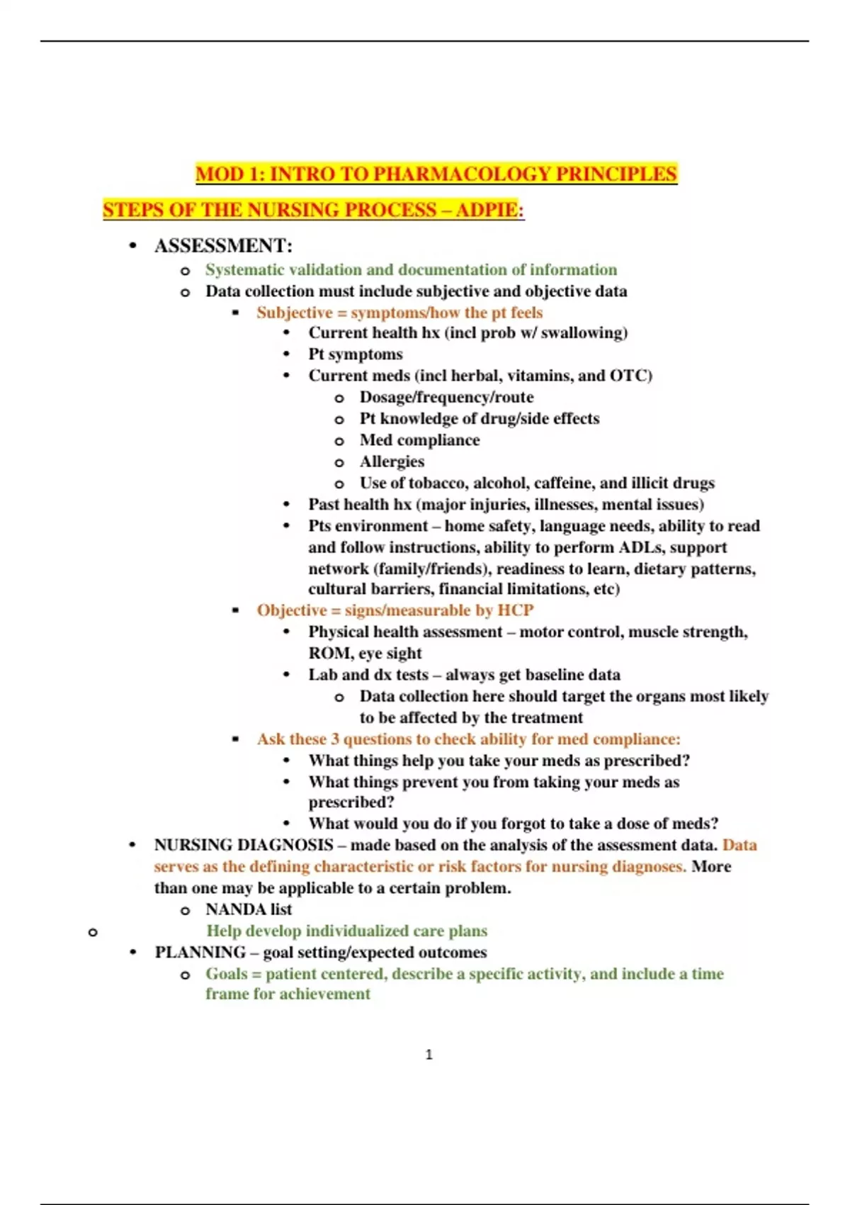 MOD 1: INTRO TO PHARMACOLOGY PRINCIPLES STEPS OF THE NURSING PROCESS – ADPIE: