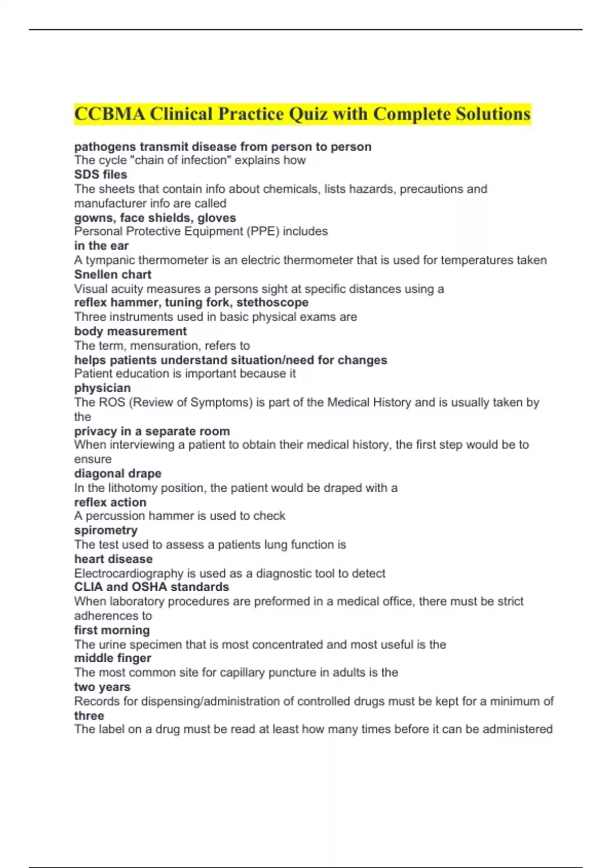 CCBMA Clinical Practice Quiz with Complete Solutions pathogens transmit disease from person to person The cycle "chain of infection" explains how SDS files The sheets that contain info about chemicals, lists hazards, precautions and manufacturer info are called gowns, face shields, gloves Personal Protective Equipment (PPE) includes in the ear A tympanic thermometer is an electric thermometer that is used for temperatures taken Snellen chart Visual acuity measures a persons sight at specific distances using a reflex hammer, tuning fork, stethoscope Three instruments used in basic physical exams are body measurement The term, mensuration, refers to helps patients understand situation/need for changes Patient education is important because it physician The ROS (Review of Symptoms) is part of the Medical History and is usually taken by the privacy in a separate room When interviewing a patient to obtain their medical history, the first step would be to ensure diagonal drape In the lithotomy position, the patient would be draped with a reflex action A percussion hammer is used to check spirometry The test used to assess a patients lung function is heart disease Electrocardiography is used as a diagnostic tool to detect CLIA and OSHA standards When laboratory procedures are preformed in a medical office, there must be strict adherences to first morning The urine specimen that is most concentrated and most useful is the middle finger The most common site for capillary puncture in adults is the two years Records for dispensing/administration of controlled drugs must be kept for a minimum of three The label on a drug must be read at least how many times before it can be administered faster rate of absorption The advantage of using parenteral administration of medication is subcutaneous injection A 25 or 27 gauge syringe with 5/8-1" needle is used for a 1000 The lens in a microscope is 100X. The Ocul