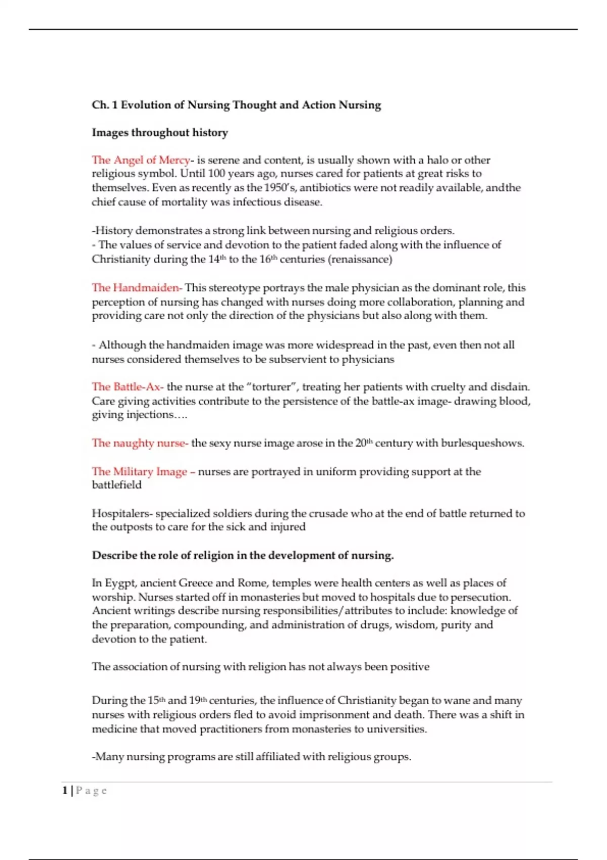TEST BANK FOR NURSING RESEARCH METHODS AND CRITICAL APPRAISAL FOREVIDENCE-BASED Ch. 1 Evolution of Nursing Thought and Action Nursing Images throughout history The Angel of Mercy- is serene and content, is usually shown with a halo or other religious symbol. Until 100 years ago, nurses cared for patients at great risks to themselves. Even as recently as the 1950’s, antibiotics were not readily available, and the chief cause of mortality was infectious disease. -History demonstrates a strong link between nursing and religious orders. - The values of service and devotion to the patient faded along with the influence of Christianity during the 14th to the 16th centuries (renaissance) The Handmaiden- This stereotype portrays the male physician as the dominant role, this perception of nursing has changed with nurses doing more collaboration, planning and providing care not only the direction of the physicians but also along with them. - Although the handmaiden image was more widespread in the past, even then not all nurses considered themselves to be subservient to physicians The Battle-Ax- the nurse at the “torturer”, treating her patients with cruelty and disdain. Care giving activities contribute to the persistence of the battle-ax image- drawing blood, giving injections…. The naughty nurse- the sexy nurse image arose in the 20th century with burlesque shows. The Military Image – nurses are portrayed in uniform providing support at the battlefield Hospitalers- specialized soldiers during the crusade who at the end of battle returned to the outposts to care for the sick and injured Describe the role of religion in the development of nursing. In Eygpt, ancient Greece and Rome, temples were health centers as well as places of worship. Nurses started off in monasteries but moved to hospitals due to persecution. Ancient writings describe nursing responsibilities/attributes to include: knowledge of the preparation, compounding, and administration of drugs, wisdom, purity and devotion to the patient. The association of nursing with religion has not always been positive During the 15th and 19th centuries, the influence of Christianity began to wane and many nurses with religious orders fled to avoid imprisonment and death. There was a shift in medicine that moved practitioners from monasteries to universities. -Many nursing programs are still affiliated with religious groups. 1 | P a g eIdentify the factors that led to the change of nursing from a vocation of men and women to a predominantly female profession WAR Define nursing in your own words. Nurses assist the individual sick or well in activities that contribute to health or it’s recovery, or a peaceful death. The international council of nurses definition: pg 11. “ Nursing encompasses autonomous and collaborative care of individuals of all ages, families, groups and communities, sick and well and in all settings. Nursing includes the promotion of health, prevention of illness and the care of ill, disabled and dying people. Advocacy, promoting of a safe environment, research, participation in shaping health policy and in patient and health systems management, and education are also key nursing roles.” Florence Nightingales contributions to nursing: The establishment of nursing as a distinct profession Introduction of a broad-based liberal education for nurses Major reform in the delivery of care in hospitals The introduction of standards to control the spread of disease of hospitals ( epidemiology), decrease of nosocomial infections Major reforms in healthcare for the military Lilian Wald and Mary Brewster- Founded the Henry Street Settlement in New York to improve the health and social conditions of poor immigrants, this is considered the start of public health nursing in the U.S. White Women- About 82% of RN’s are white, 6% are male. Major nursing organizations agree that we need a more diversified nursing force. Examples of nursing activities Dependent activities -Administering prescribed medication -Assisting with a diagnostic test - Administering IV fluids -Ensuring that the patient received the prescribed diet Independent Activities 2 | P a g e-Evaluating the patient’s response to medication and withholding the next dose if the patient has a negative reaction -Teaching the patient what to expect from the diagnostic test , preparing the patient for the test. -Evaluating the patient’s response to treatment, monitoring the flow rate -Teaching a pregnant woman about additional nutrients needed in her diet. Full- spectrum nurse: Nurses use clinical judgement, critical thinking, and problem solving as they care for patients. Clinical Judgment- involved observing, comparing, contrasting and evaluating the client’s condition to determine where change has occurred. Critical thinking- is a reflective thinking process that involved collecting information, analyzing the adequacy and accuracy of the information. Problem solving- is a process by which nurses consider an issue and attempt to find a satisfactory solution to achieve the best outcomes. Learning outcomes… Pgs 12-24 Differentiate among the various forms of education Practical and Vocational Nursing Education • Known as LVNs or LPNs • May attend one of approximately 1200 approved programs given at technical or community college • Usually lasts a year in both classroom and clinical teaching • After completing education program must pass NCLEX-PN exam Registered Nursing entry education • 5 educational pathways lead to an RN • All must complete NCLEX-RN o Diploma programs ▪ Last 3 years focuses in clinical experiences o Associate degree programs ▪ Offered in community college ▪ Account for 53% of RN programs in the U.S. o 3 | P a g e Baccalaureate degree programs ▪ Lasts at least 8 semesters▪ About 42% of nursing programs o Master’s entry programs ▪ Usually has another baccalaureate degree in another field ▪ Programs are usually 3 years of 