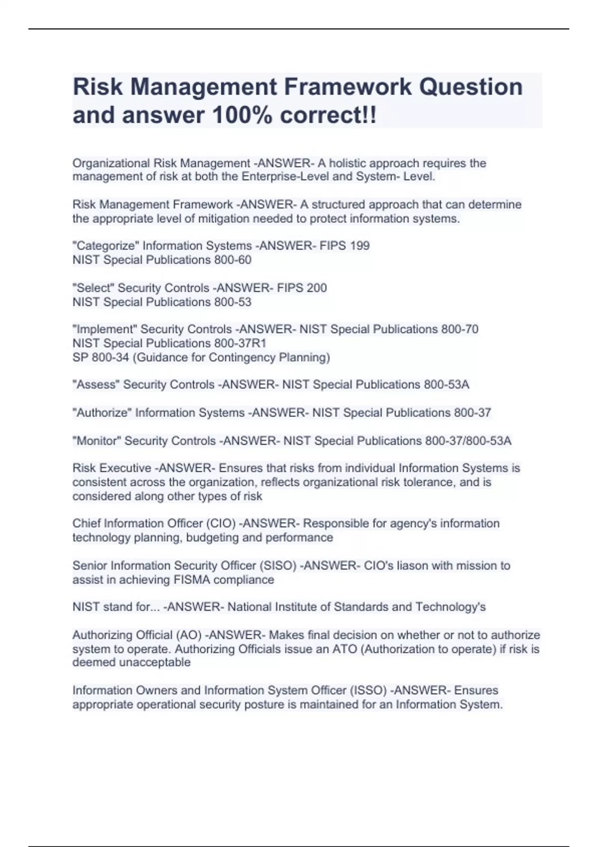 Risk Management Framework Question and answer 100% correct!!