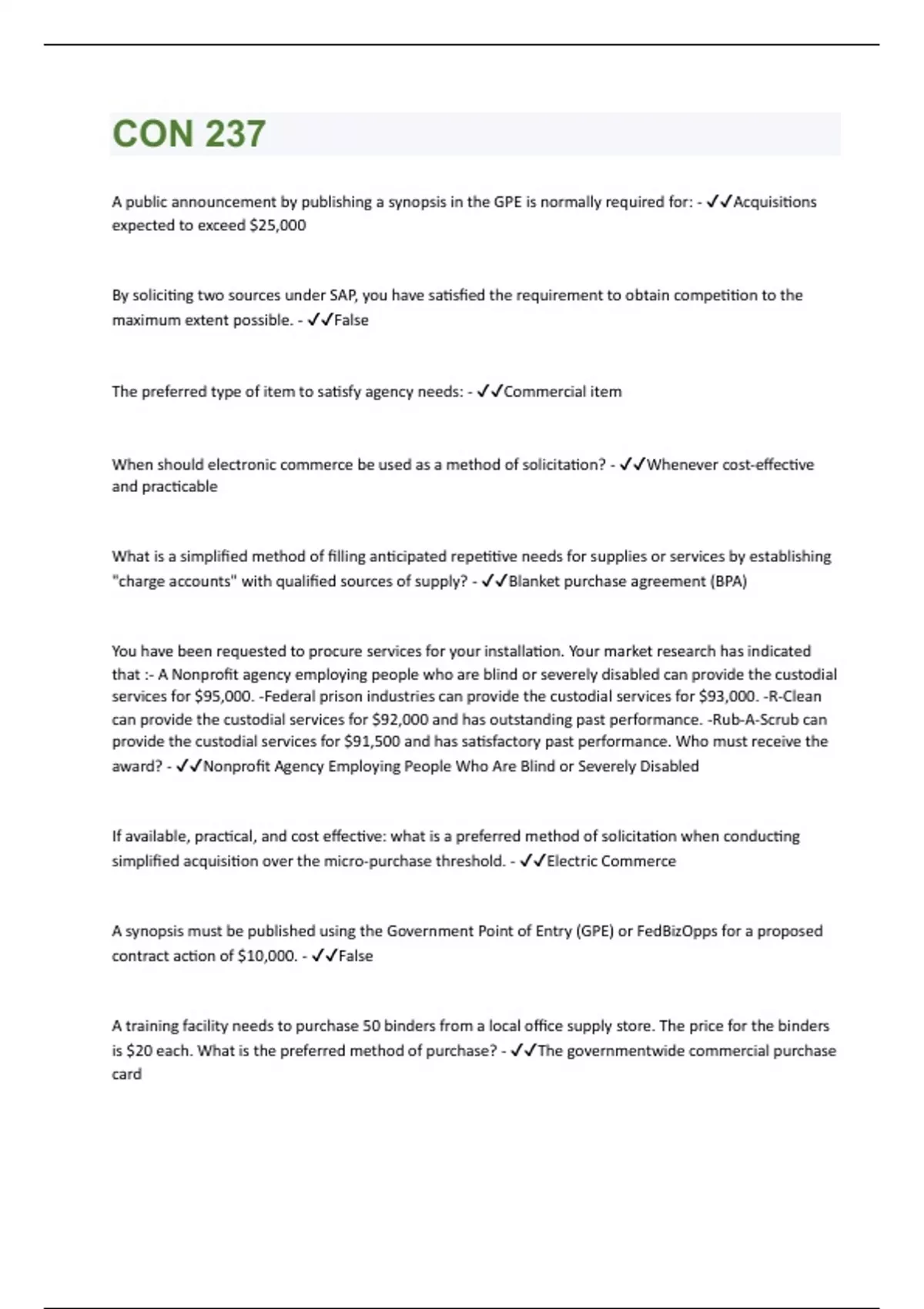 A public announcement by publishing a synopsis in the GPE is normally required for: - Acquisitions expected to exceed $25,000 By soliciting two sources under SAP, you have satisfied the requirement to obtain competition to the maximum extent possible. - False The preferred type of item to satisfy agency needs: - Commercial item When should electronic commerce be used as a method of solicitation? - Whenever cost-effective and practicable What is a simplified method of filling anticipated repetitive needs for supplies or services by establishing "charge accounts" with qualified sources of supply? - Blanket purchase agreement (BPA) You have been requested to procure services for your installation. Your market research has indicated that :- A Nonprofit agency employing people who are blind or severely disabled can provide the custodial services for $95,000. -Federal prison industries can provide the custodial services for $93,000. -R-Clean can provide the custodial services for $92,000 and has outstanding past performance. -Rub-A-Scrub can provide the custodial services for $91,500 and has satisfactory past performance. Who must receive the award? - Nonprofit Agency Employing People Who Are Blind or Severely Disabled If available, practical, and cost effective: what is a preferred method of solicitation when conducting simplified acquisition over the micro-purchase threshold. - Electric Commerce A synopsis must be published using the Government Point of Entry (GPE) or FedBizOpps for a proposed contract action of $10,000. - False A training facility needs to purchase 50 binders from a local office supply store. The price for the binders is $20 each. What is the preferred method of purchase? - The governmentwide commercial purchase card