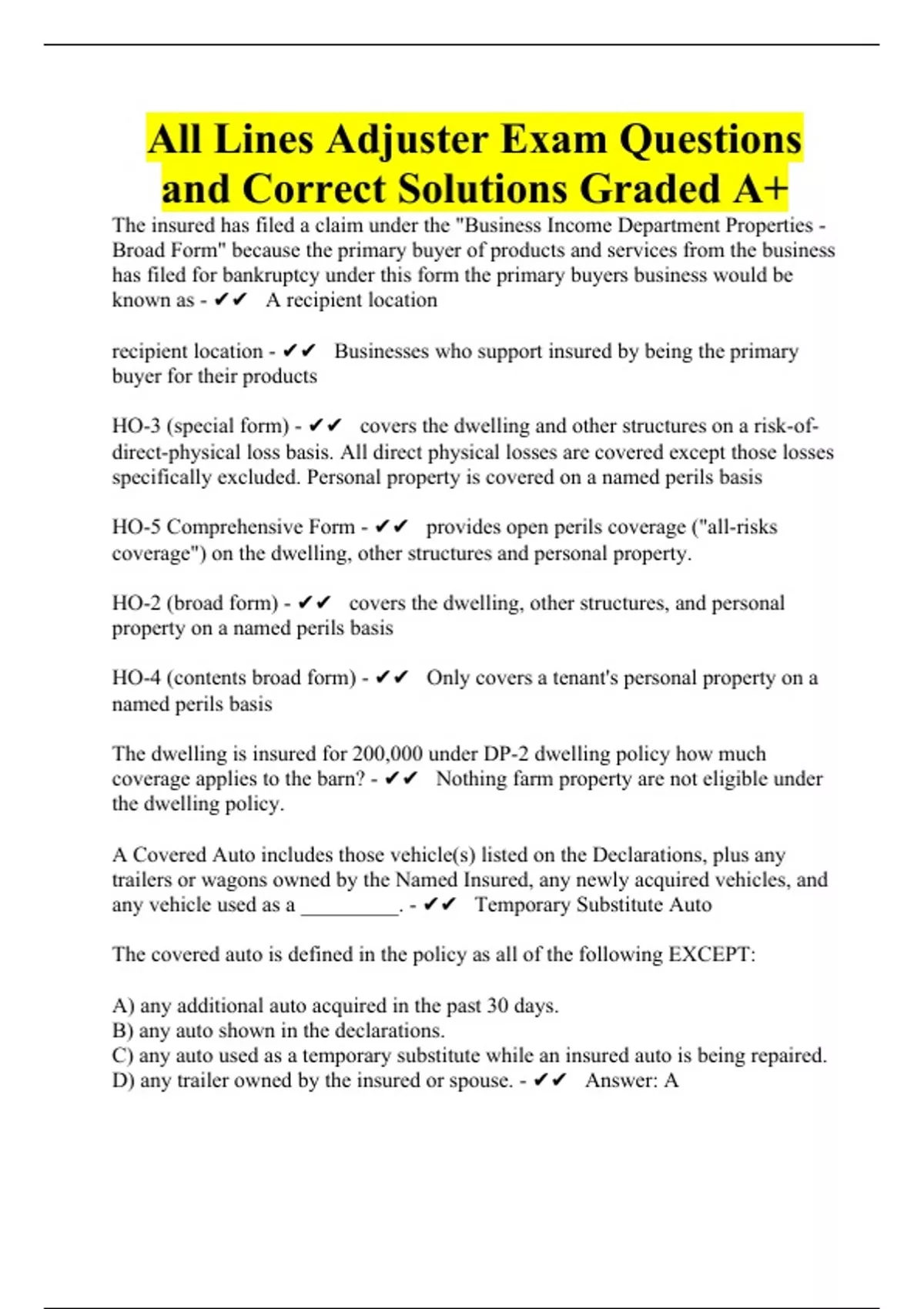 All Lines Adjuster Exam Questions and Correct Solutions Graded A+