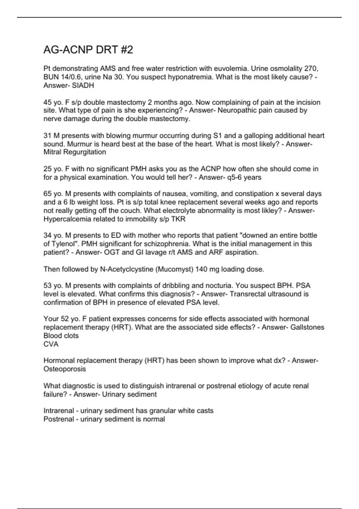 Pt demonstrating AMS and free water restriction with euvolemia. Urine osmolality 270, BUN 14/0.6, urine Na 30. You suspect hyponatremia. What is the most likely cause? - Answer- SIADH 45 yo. F s/p double mastectomy 2 months ago. Now complaining of pain at the incision site. What type of pain is she experiencing? - Answer- Neuropathic pain caused by nerve damage during the double mastectomy. 31 M presents with blowing murmur occurring during S1 and a galloping additional heart sound. Murmur is heard best at the base of the heart. What is most likely? - Answer- Mitral Regurgitation 25 yo. F with no significant PMH asks you as the ACNP how often she should come in for a physical examination. You would tell her? - Answer- q5-6 years 65 yo. M presents with complaints of nausea, vomiting, and constipation x several days and a 6 lb weight loss. Pt is s/p total knee replacement several weeks ago and reports not really getting off the couch. What electrolyte abnormality is most likley? - Answer- Hypercalcemia related to immobility s/p TKR 34 yo. M presents to ED with mother who reports that patient "downed an entire bottle of Tylenol". PMH significant for schizophrenia. What is the initial management in this patient? - Answer- OGT and GI lavage r/t AMS and ARF aspiration. Then followed by N-Acetyclcystine (Mucomyst) 140 mg loading dose. 53 yo. M presents with complaints of dribbling and nocturia. You suspect BPH. PSA level is elevated. What confirms this diagnosis? - Answer- Transrectal ultrasound is confirmation of BPH in presence of elevated PSA level. Your 52 yo. F patient expresses concerns for side effects associated with hormonal replacement therapy (HRT). What are the associated side effects? - Answer- Gallstones Blood clots CVA Hormonal replacement therapy (HRT) has been shown to improve what dx? - Answer- Osteoporosis What diagnostic is used to distinguish intrarenal or postrenal etiology of acute renal failure? - Answer- Urinary sediment Intrarenal - urinary sediment has granular white casts Postrenal - urinary sediment is normal