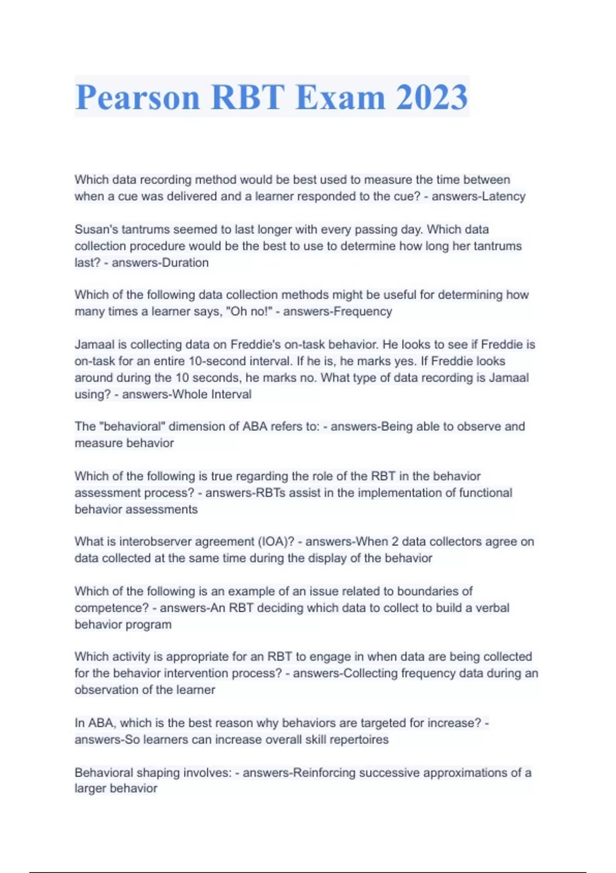 Pearson RBT Exam with 100% Correct Answers 2023 Which data recording method would be best used to measure the time between when a cue was delivered and a learner responded to the cue? - answers-Latency Susan's tantrums seemed to last longer with every passing day. Which data collection procedure would be the best to use to determine how long her tantrums last? - answers-Duration