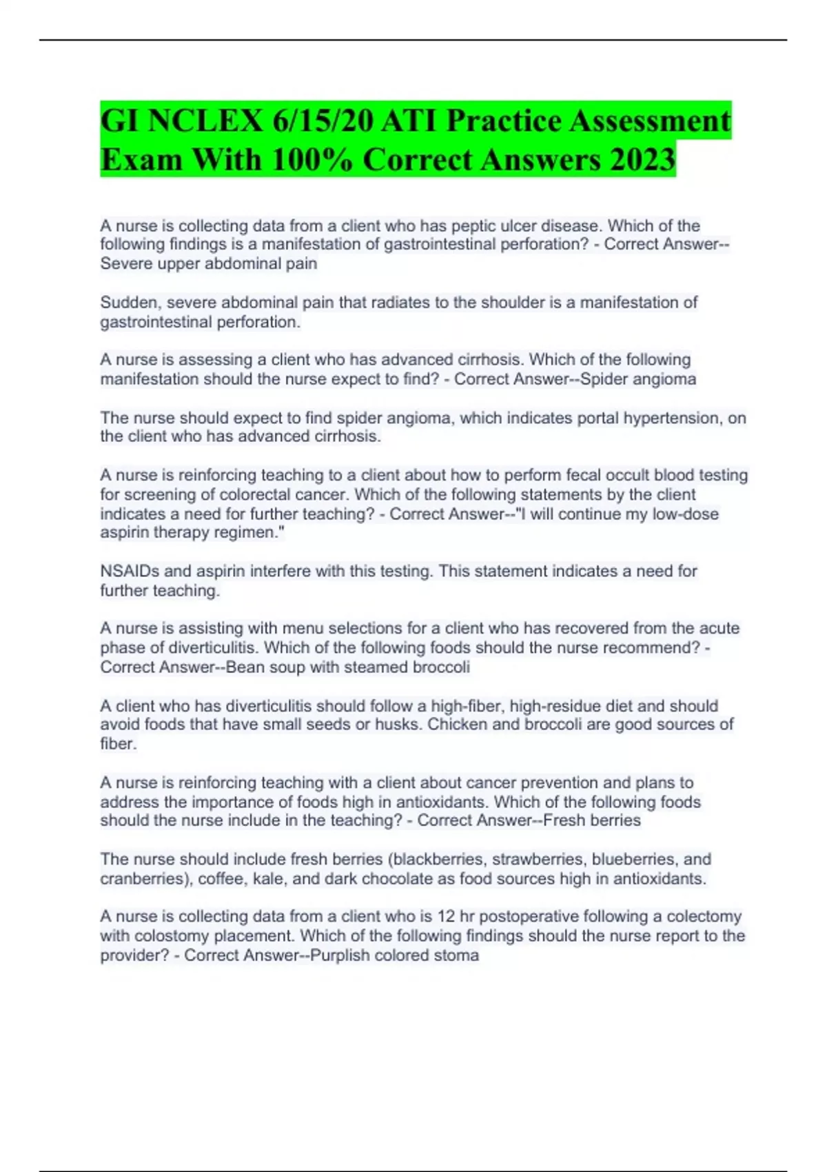 GI NCLEX 6/15/20 ATI Practice Assessment Exam With 100% Correct Answers 2023