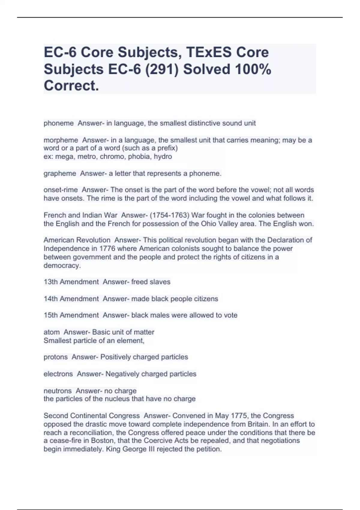 EC-6 Core Subjects, TExES Core Subjects EC-6 (291) Solved 100% Correct.