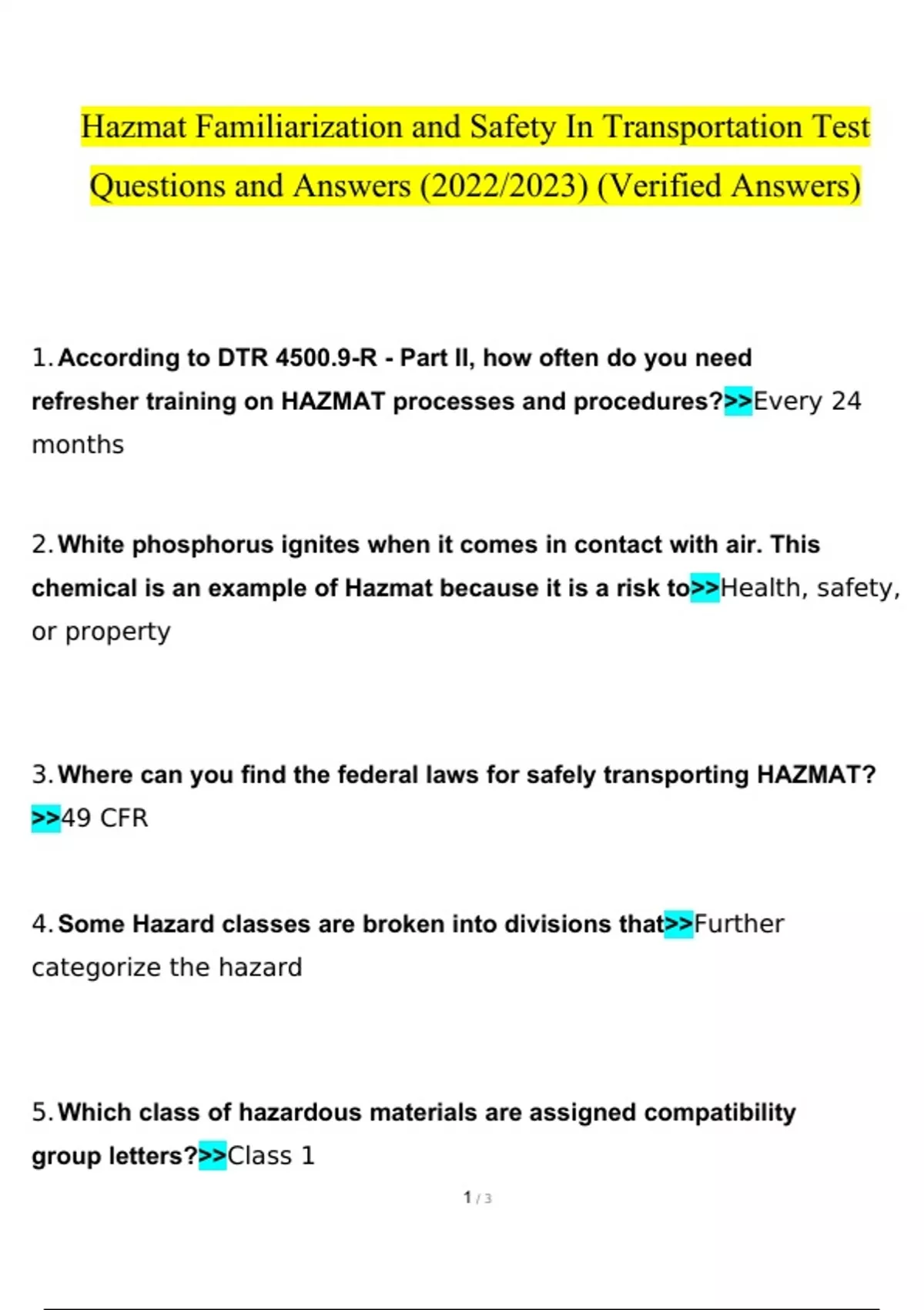 Hazmat Familiarization and Safety In Transportation Questions and Answers Latest [100% correct answers]