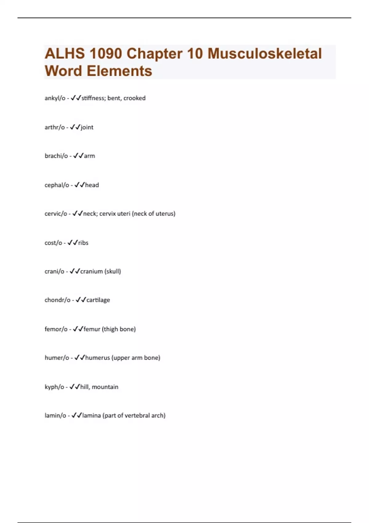 ankyl/o - stiffness; bent, crooked arthr/o - joint brachi/o - arm cephal/o - head cervic/o - neck; cervix uteri (neck of uterus) cost/o - ribs crani/o - cranium (skull) chondr/o - cartilage femor/o - femur (thigh bone) humer/o - humerus (upper arm bone) kyph/o - hill, mountain lamin/o - lamina (part of vertebral arch)lord/o - curve, swayback lumb/o - loins (lower back) muscul/o, my/o - muscle myel/o - bone marrow; spinal cord