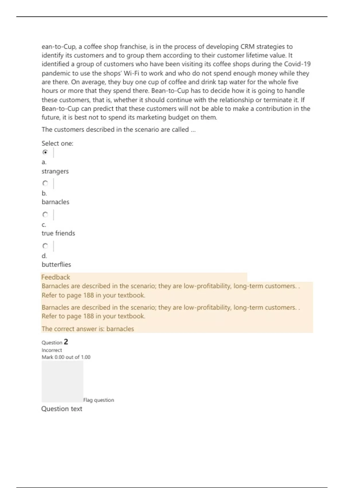 Barnacles are described in the scenario; they are low-profitability, long-term customers. .