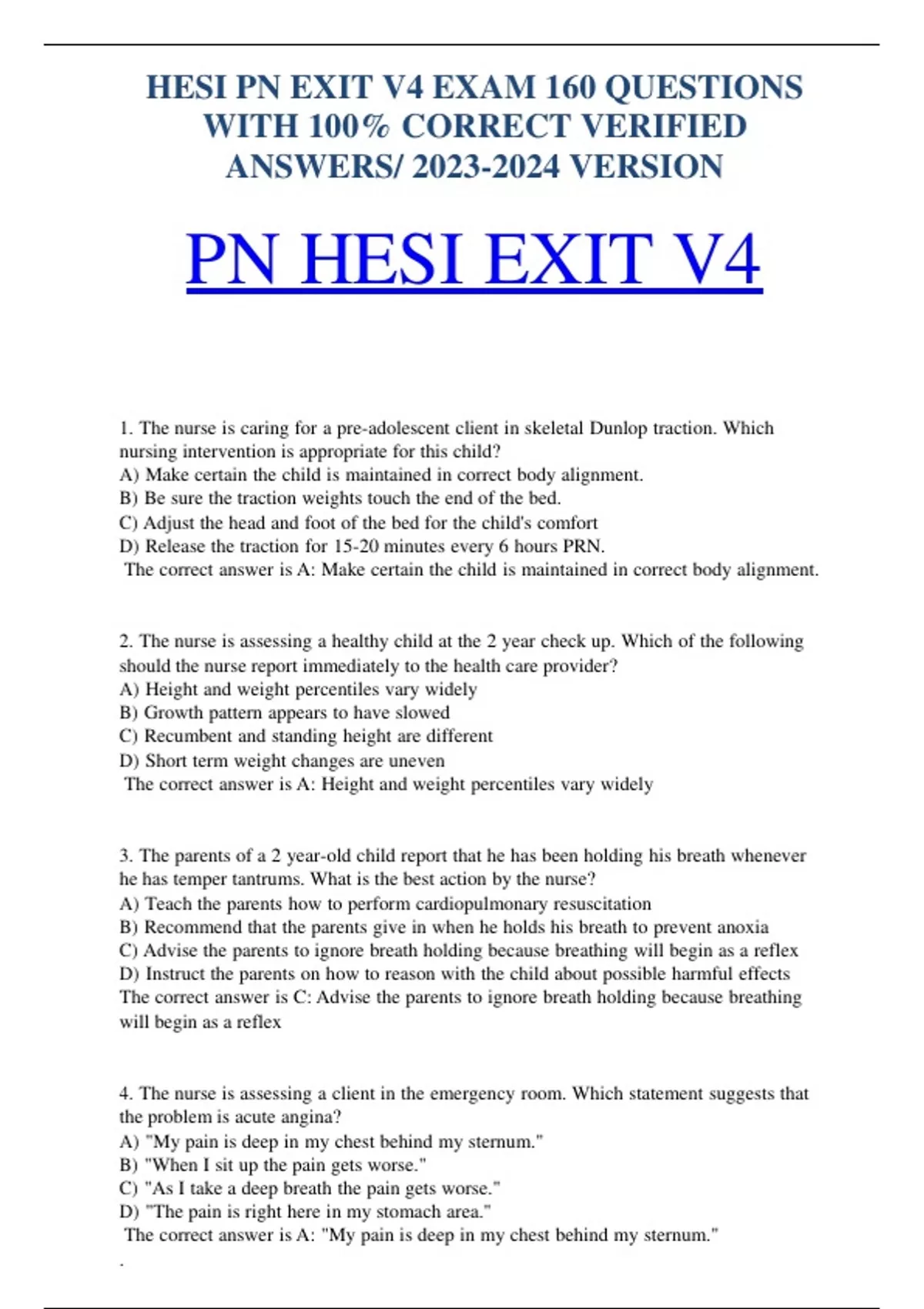 HESI PN EXIT V4 EXAM 160 QUESTIONS WITH 100% CORRECT VERIFIED ANSWERS/ VERSION PN HESI EXIT V4 1. The nurse is caring for a pre-adolescent client in skeletal Dunlop traction. Which nursing intervention is appropriate for this child? A) Make certain the child is maintained in correct body alignment. B) Be sure the traction weights touch the end of the bed. C) Adjust the head and foot of the bed for the child's comfort D) Release the traction for 15-20 minutes every 6 hours PRN. The correct answer is A: Make certain the child is maintained in correct body alignment. 2. The nurse is assessing a healthy child at the 2 year check up. Which of the following should the nurse report immediately to the health care provider? A) Height and weight percentiles vary widely B) Growth pattern appears to have slowed C) Recumbent and standing height are different D) Short term weight changes are uneven The correct answer is A: Height and weight percentiles vary widely 3. The parents of a 2 year-old child report that he has been holding his breath whenever he has temper tantrums. What is the best action by the nurse? A) Teach the parents how to perform cardiopulmonary resuscitation B) Recommend that the parents give in when he holds his breath to prevent anoxia C) Advise the parents to ignore breath holding because breathing will begin as a reflex D) Instruct the parents on how to reason with the child about possible harmful effects The correct answer is C: Advise the parents to ignore breath holding because breathing will begin as a reflex 4. The nurse is assessing a client in the emergency room. Which statement suggests that the problem is acute angina? A) "My pain is deep in my chest behind my sternum." B) "When I sit up the pain gets worse." C) "As I take a deep breath the pain gets worse." D) "The pain is right here in my stomach area." The correct answer is A: "My pain is deep in my chest behind my sternum."