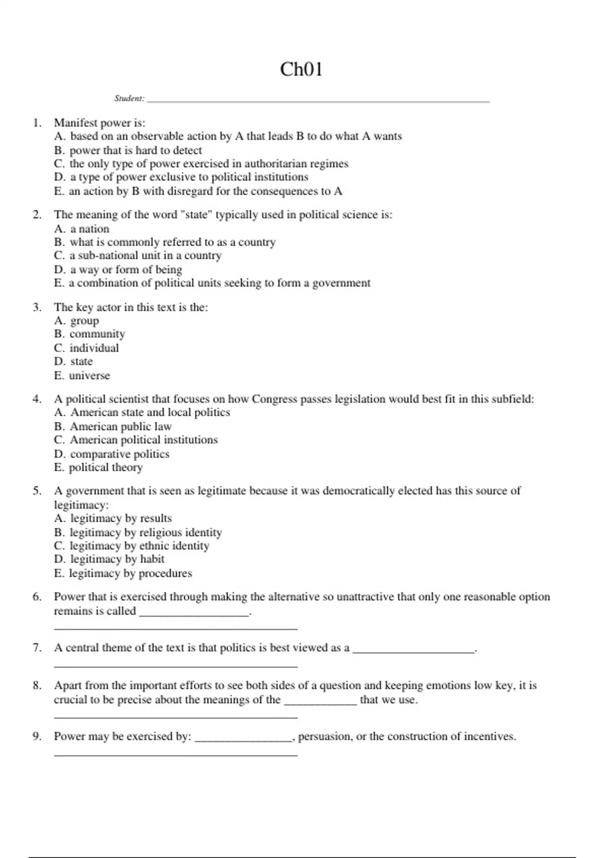 9. Power may be exercised by: ________________, persuasion, or the construction of incentives.