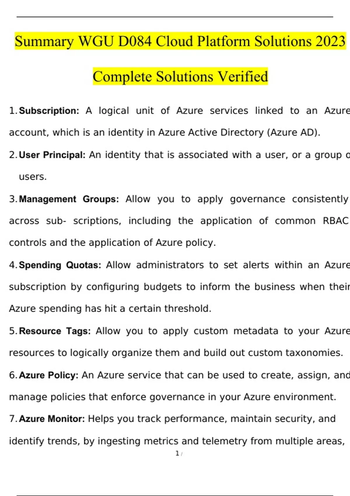 Summary WGU D084 Cloud Platform Solutions 2023 Complete Solutions Verified