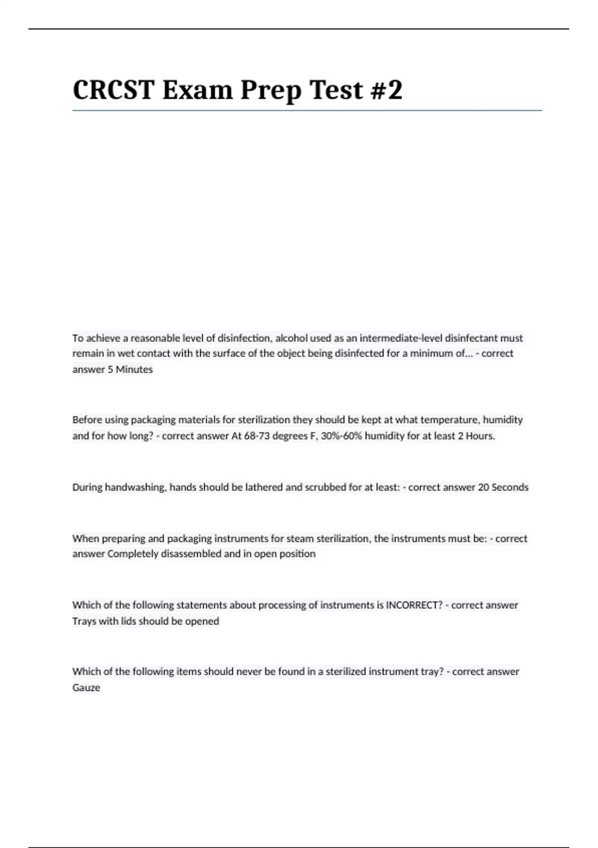 CRCST Exam Prep Test #2 To achieve a reasonable level of disinfection, alcohol used as an intermediate-level disinfectant must remain in wet contact with the surface of the object being disinfected for a minimum of... - correct answer 5 Minutes Before using packaging materials for sterilization they should be kept at what temperature, humidity and for how long? - correct answer At 68-73 degrees F, 30%-60% humidity for at least 2 Hours. During handwashing, hands should be lathered and scrubbed for at least: - correct answer 20 Seconds When preparing and packaging instruments for steam sterilization, the instruments must be: - correct answer Completely disassembled and in open position Which of the following statements about processing of instruments is INCORRECT? - correct answer Trays with lids should be opened Which of the following items should never be found in a sterilized instrument tray? - correct answer Gauze This system generates automated request for patients care items? - correct answer Centralized patient order entry system This body creates and revises standards for packaging requirements for sterilizing water for irrigation - correct answer USP-NF (United States Pharmacopeia-National Formulary The humidity in the sterilization equipment room should between.. - correct answer 30% to 60% Which microorganism is used in the Biological Indicator for monitoring Ethylene Oxide? - correct answer Bacillus atrophaeus What is the reason behind double peel pouching? - correct answer It allows aseptic presentation of the sterile item without contamination What is the reason for tamper-evident lock on a rigid container? - correct answer It indicates the container has not been opened or tampered with Which of the following is designed to prevent surgical instrument tray wrappers from rips, holes and tears? - correct answer Corner protectors When loading the sterilizer with a mixed load of textile and metal goods, the textile packs should be placed - correct answer on the top rack All of the following will cause wet packs except - correct answer wrapped items with the missing CI Bowie Dick tests should be run in: - correct answer Dynamic air removal steam sterilizers Where should Bowie Dick test pack be placed in the sterilization chamber? - correct answer Above the drain on the bottom rack What is the sterilizer setting for Bowie Dick test? - correct answer 3 1/2 to 4 minutes exposure at 270-273 degrees F Temperature and humidity of the Work Environment should be measured.. - correct answer daily Which of the following body systems is related to Arthro? - correct answer Skeletal The purpose of instrument stringer is - correct answer For keeping hinged instruments in open positions The purpose of instrument count is to provide - correct answer Detailed list of tray contents Which agency regulates Employee Right to Know act? - correct answer OSHA (The Occupational Safety and Health Administration) Which of the following information is not required on the SDS sheet? - correct answer Emergency phone number of physicians The Right-To-Know Standard requires employers to have which of the following available for employees? - correct answer Safety Data Sheets for chemicals When should a new employee become familiar with MSDS's in CS/SPD? - correct answer On their first day at work Safety Data Sheets are provided by - correct answer Product Manufacturer The "pass" reading of a CI means: - correct answer The parameters for sterilization have been met What is the cleaning tool for suction devices? - correct answer Cleaning Brush Scissors with black rings have what type of blades? - correct answer microgrind/supercut blades This body system controls growth and maintains body functions and chemical messengers - correct answer Endocrine System Which of these materials is used to test for the sharpness of Rongeur? - correct answer Index Card Which of the following is used to test the sharpness of Osteotomes? - correct answer Plastic Dowel Rod The sharpness of all of the following instruments are tested with index card except - correct answer Osteotome Kerrison rongeur is considered to be sharp if it can - correct answer punch a clean hole through an index card How are scissors with length longer that 4 1/2 inches be tested? - correct answer red test material Which of the following scissors is designed to have the sharpest cutting edge? - correct answer Black-handled What material is used to test for the sharpness of 4 inches or smaller scissors? - correct answer Yellow test material Which of the following will be used to determine a stain or rust on an instrument? - correct answer Eraser Test Scissors with tungsten carbide cutting edges are usually identified by - correct answer Gold Handles the purpose of a suction stylet is to - correct answer unclog the suction during surgery Which of the following is used to rinse off traces of enzymatic solution from endoscopes' working channel? - correct answer Treated water Which of the following steps is not recommended for device taping as instrument identification method? - correct answer Place the tape on ring of the instrument Which of the following is used as tamper-evident seal for rigid containers? - correct answer Breakable plastic seal How many times should instrument marking tape be wrapped around the instrument? - correct answer 1 to 1 1/2 What is the correct way to measure the hemostatic forceps? - correct answer From the distal tip to the bottom of the ring What is the correct way to measure the Tissue forceps? - correct answer From the proximal end to the tips Self-retaining retractor is working properly if - correct answer After pushing down the retractor lever and let it go, lever it springs back up A chemical process applied during the instrument manufacturing process that keeps corrosion-resistant finish on instruments is - correct answer Passivation Which of the following cleaning machines will be appropriate for removing debris from box locks 