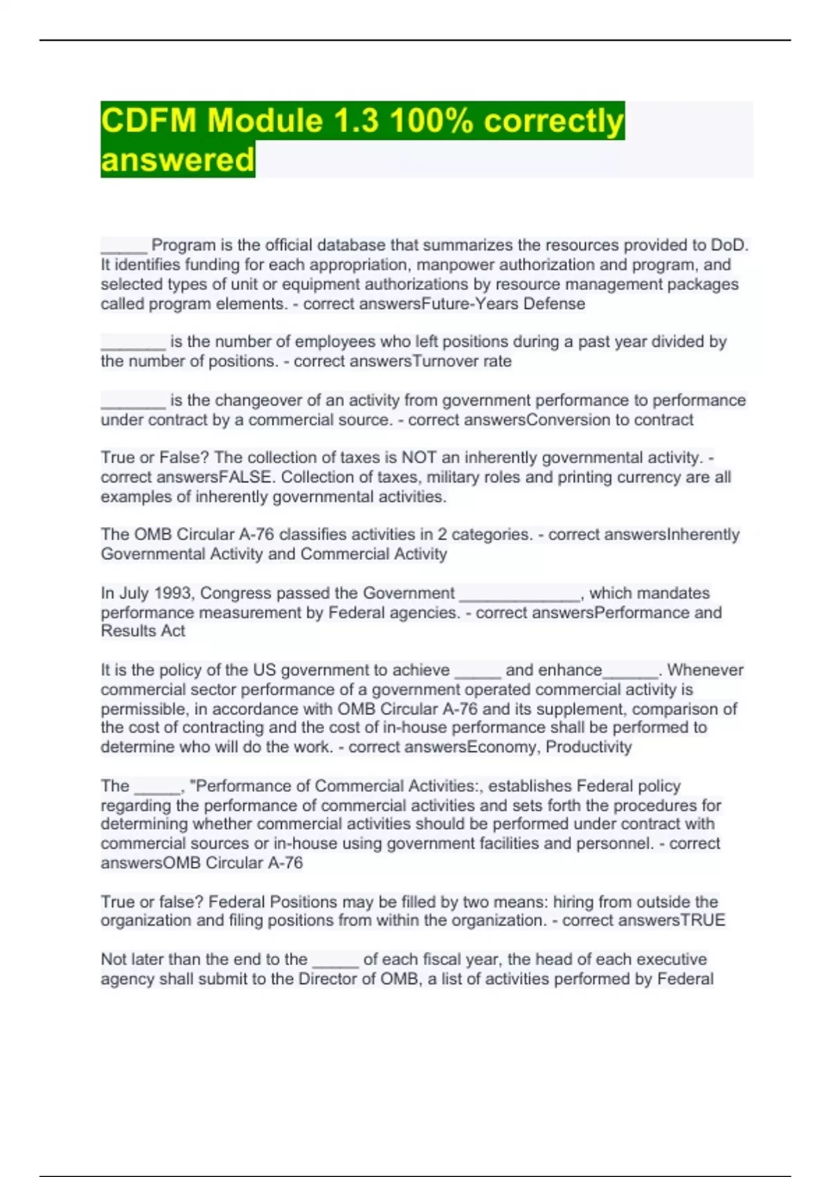 _____ Program is the official database that summarizes the resources provided to DoD. It identifies funding for each appropriation, manpower authorization, and program, and selected types of unit or equipment authorizations by resource management packages called program elements. - correct answers Future-Years Defense _______ is the number of employees who left positions during the past year divided by the number of positions. - correct answers Turnover rate