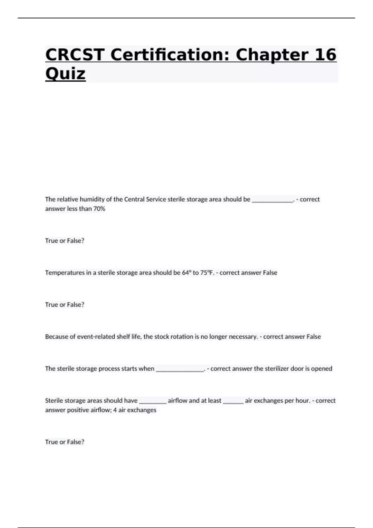 CRCST Certification: Chapter 16 Quiz The relative humidity of the Central Service sterile storage area should be ____________. - correct answer less than 70% True or False? Temperatures in a sterile storage area should be 64° to 75°F. - correct answer False True or False? Because of event-related shelf life, the stock rotation is no longer necessary. - correct answer False The sterile storage process starts when ______________. - correct answer the sterilizer door is opened Sterile storage areas should have ________ airflow and at least ______ air exchanges per hour. - correct answer positive airflow; 4 air exchanges True or False? Temperature and humidity levels in the sterile storage area should be checked and recorded at least weekly. - correct answer False The shelving system of choice for the sterile storage area is _____________. - correct answer closed Trays which overhand shelving can _________. - correct answer become contaminated The type of shelving that leaves packaging the most vulnerable is _______. - correct answer open The bottom shelf of any sterile storage system should be _________. - correct answer solid and eight to ten inches from the floor Sterile trays should ___________________, ___________________ and ______________. - correct answer -Not be touched until they are properly cooled -Be lifted not dragged off the sterilizer cart -Be checked to be sure the chemical indicators have turned the appropriate color Wrapped trays should not be stacked because ________________. - correct answer it can cause holes in the wrapper of the bottom tray Outside shipping containers should be __________________. - correct answer removed prior to placing the items in storage True or False? Event-related shelf life means items are safe until opened for use. - correct answer False True or False? Sterilized packages may be jeopardized due to storage practices. - correct answer True