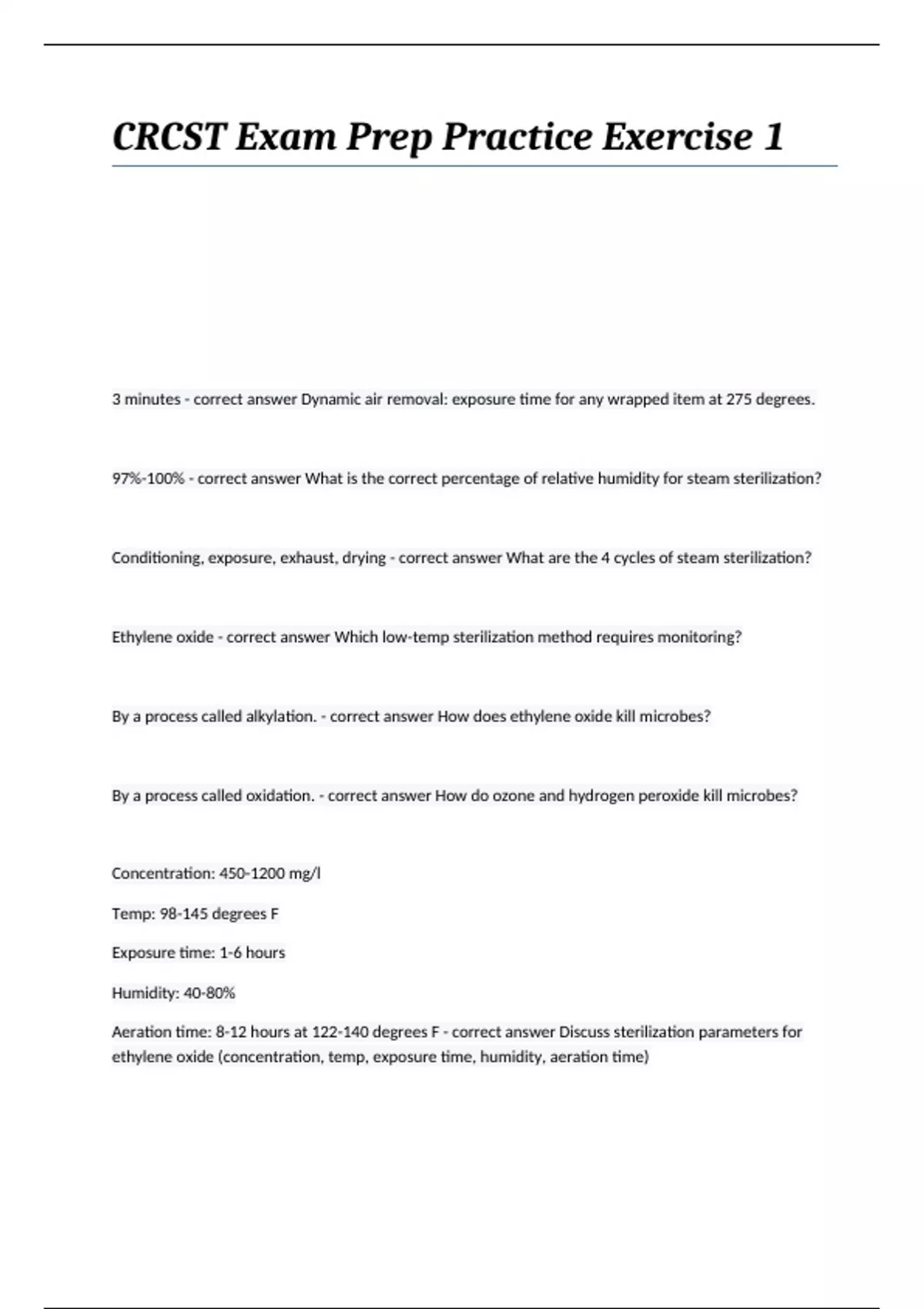 CRCST Exam Prep Practice Exercise 1 3 minutes - correct answer Dynamic air removal: exposure time for any wrapped item at 275 degrees. 97%-100% - correct answer What is the correct percentage of relative humidity for steam sterilization? Conditioning, exposure, exhaust, drying - correct answer What are the 4 cycles of steam sterilization? Ethylene oxide - correct answer Which low-temp sterilization method requires monitoring? By a process called alkylation. - correct answer How does ethylene oxide kill microbes? By a process called oxidation. - correct answer How do ozone and hydrogen peroxide kill microbes? Concentration: 450-1200 mg/l Temp: 98-145 degrees F Exposure time: 1-6 hours Humidity: 40-80% Aeration time: 8-12 hours at 122-140 degrees F - correct answer Discuss sterilization parameters for ethylene oxide (concentration, temp, exposure time, humidity, aeration time) Bacillus atrophaeus - correct answer What is the microorganism of choice for ethylene oxide sterilization? Vacuum, injection, diffusion, plasma, vent - correct answer What are the five phases of gas plasma sterilization? Cellulose, muslin wraps - correct answer Which materials are not recommended for use in hydrogen peroxide sterilization method She? Geobacillus stearothermophilus - correct answer What is the microorganism of choice for hydrogen peroxide gas plasma sterilization? Time: 24-75 minutes Temp: less than 131 degrees F Concentration: 59-95% Vacuum level: auto controlled Plasma: auto controlled - correct answer Discuss hydrogen peroxide gas plasma sterilization parameters (time, temp, concentration, vacuum level, plasma) Conditioning, leak test, sterilization, aeration - correct answer What are the 4 cycles for vaporized hydrogen peroxide systems? Temp: less than 122 degrees F Concentration: 59% Time: 28-55 minutes Other: preset cycles - correct answer Discuss vaporized hydrogen peroxide sterilization parameters (temp, concentration, time, other). Geobacillus stearothermophilus - correct answer What is the microorganism of choice for vaporized hydrogen peroxide (VHP)? Temp: 87.4-97 degrees F Concentration: 59% Humidity: 85-100% Time: 4.5 hours - correct answer Discuss ozone sterilization parameters (temp, concentration, humidity, time). Geobacillus stearothermophilus - correct answer What is the microorganism of choice for OzOne sterilization? Cellulose, linens, liquids, powders - correct answer What materials cannot be processed in VHP or gas plasma sterilizers? Rubber, latex, textiles, copper, brass, bronze, zinc, nickel. - correct answer What materials cannot be processed in an ozone sterilizer? 30-60% - correct answer What are the parameters for relative humidity in the decontamination area? 60-65 degrees F - correct answer What should the temperature range be in the decontamination are? 80-110 degrees F - correct answer What is the temperature range for water in the decontamination area? No less than 10 per hour. - correct answer How many air exchanges are required in the decontamination area? 140 degrees F - correct answer This temperature should not be exceeded when using enzymatic cleaners. 6-8 - correct answer What is the pH of neutral detergents? Quaternary ammonium, alcohols, phenolic, chlorines, iodophors - correct answer Name the most common low-level or intermediate-level disinfectants. Non-sporicidal, must remain wet for 6-10 minutes - correct answer Discuss characteristics of quats (is or is not sporicidal, wet contact time) Non-sporicidal, 5 minute wet-contact time - correct answer Discuss characteristics of alcohols (is or is not sporicidal, wet contact time) Member of the halogen family, Non-sporicidal, 2.5 minute wet contact time, 1:10 dilution of 5.25% suggested for use by the CDC - correct answer Discuss characteristics of chlorine (What family is it in, is or is not sporicidal, wet contact time, dilution suggested) Alkylation - correct answer Process by which gluteraldehyde kills microbes Glutaraldehyde, orthodox-pthalaldehyde, hydrogen peroxide, paracetic acid - correct answer Name the high level disinfectants Non-sporicidal - correct answer Discuss characteristics of phenolics Kills bacteria within 2 minutes for sterilization, soak time is 6-10 hours, it becomes unstable after 14 days - correct answer Discuss characteristics of glutaraldehyde Has a 14 day reuse life, can be discarded down the drain, does not have a sterilants label claim - correct answer Discuss characteristics of OPA [orthopthalaldehyde] Can be used as a sterilant at the right concentrations, kills Bacteria and viruses - correct answer Discuss characteristics of hydrogen peroxide as an HLD. Broad spectrum HLD, may be used as sterilant in the appropriate AER, achieves HLD in 5 minutes - correct answer Discuss characteristics of paracetic acid 150-170 degrees F for 30 minutes - correct answer What is the appropriate time/temperature range for a pasteurizer? 68-73 degrees F - correct answer What is the appropriate temperature for the assembly area? 30-60% - correct answer What is the appropriate humidity for the assembly area? Designed to react to all critical parameters and to be equivalent to or exceed performance requirements, over a specified range of sterilization cycles - correct answer Class 5 Integrator indicator Also called verification indicators or cycle-specific indicators, designed to react to all parameters of a specific sterilization cycle. - correct answer Class 6 Integrator Indicator Paper, polyolefin plastic, nonwoven - correct answer Most common disposable packaging materials in use Also called type 140 cotton, barrier cloth, calico. Made of 100% cotton with 140 thread count per square inch. - correct answer What are the other names for MUSLIN? what is it made of? and what is its thread count per square inch? Member of halogen family, 2 minute wet contact time, most widely used is providence-iodine - correct answer Discuss characteristics of iodophores (family it's in, wet contact time, most widely u