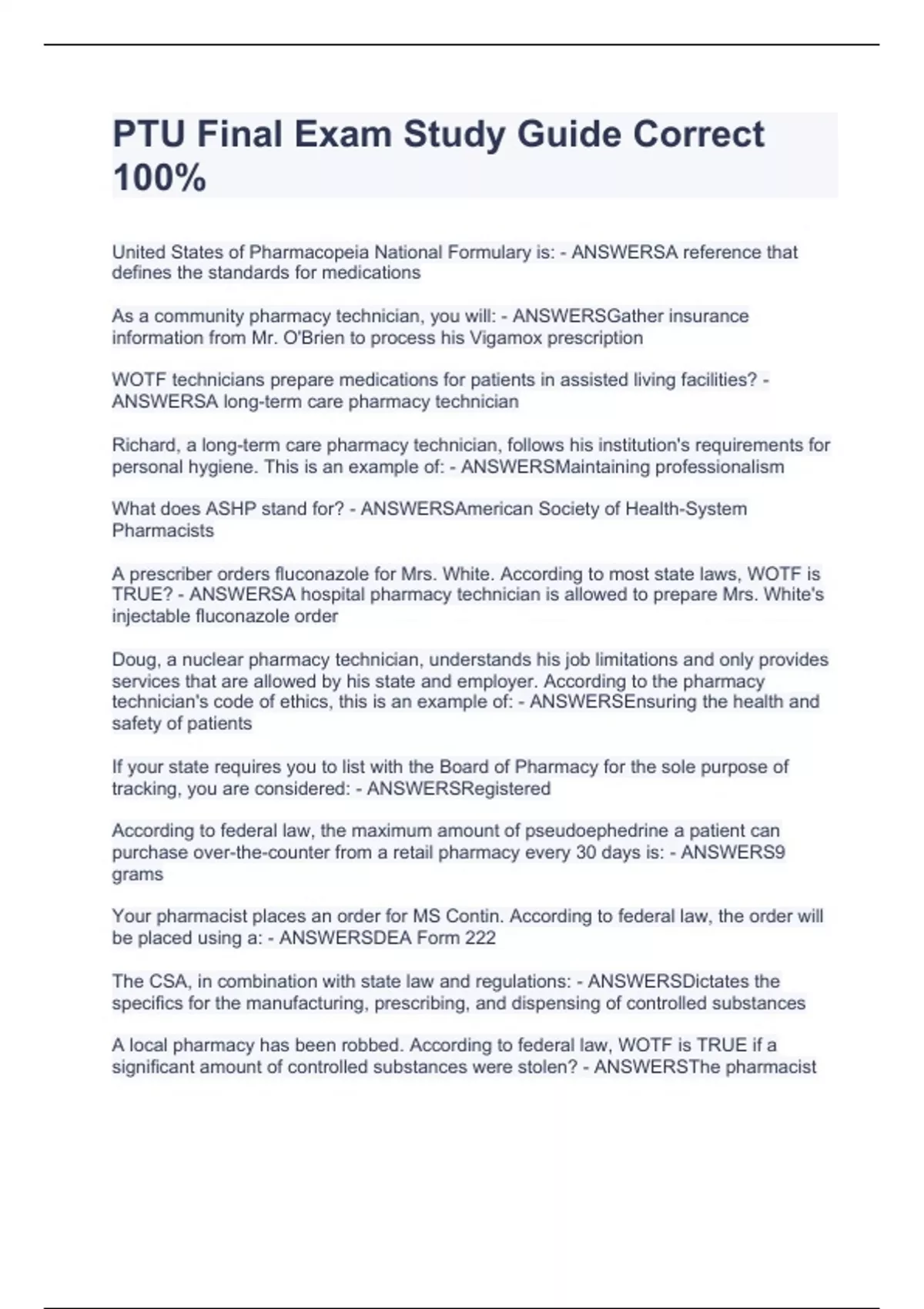 United States of Pharmacopeia National Formulary is: - ANSWERSA reference that defines the standards for medications As a community pharmacy technician, you will: - ANSWERSGather insurance information from Mr. O'Brien to process his Vigamox prescription WOTF technicians prepare medications for patients in assisted living facilities? - ANSWERSA long-term care pharmacy technician Richard, a long-term care pharmacy technician, follows his institution's requirements for personal hygiene. This is an example of: - ANSWERSMaintaining professionalism What does ASHP stand for? - ANSWERSAmerican Society of Health-System Pharmacists A prescriber orders fluconazole for Mrs. White. According to most state laws, WOTF is TRUE? - ANSWERSA hospital pharmacy technician is allowed to prepare Mrs. White's injectable fluconazole order Doug, a nuclear pharmacy technician, understands his job limitations and only provides services that are allowed by his state and employer. According to the pharmacy technician's code of ethics, this is an example of: - ANSWERSEnsuring the health and safety of patients If your state requires you to list with the Board of Pharmacy for the sole purpose of tracking, you are considered: - ANSWERSRegistered According to federal law, the maximum amount of pseudoephedrine a patient can purchase over-the-counter from a retail pharmacy every 30 days is: - ANSWERS9 grams
