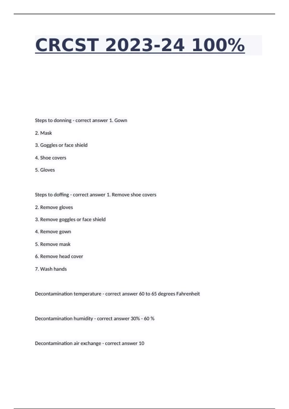 Steps to donning - correct answer 1. Gown 2. Mask 3. Goggles or face shield 4. Shoe covers 5. Gloves Steps to doffing - correct answer 1. Remove shoe covers 2. Remove gloves 3. Remove goggles or face shield 4. Remove gown 5. Remove mask 6. Remove head cover 7. Wash hands Decontamination temperature - correct answer 60 to 65 degrees Fahrenheit Decontamination humidity - correct answer 30% - 60 % Decontamination air exchange - correct answer 10 General work areas temperature - correct answer 68 to 70 degrees Fahrenheit General work areas humidity - correct answer 30% - 60%