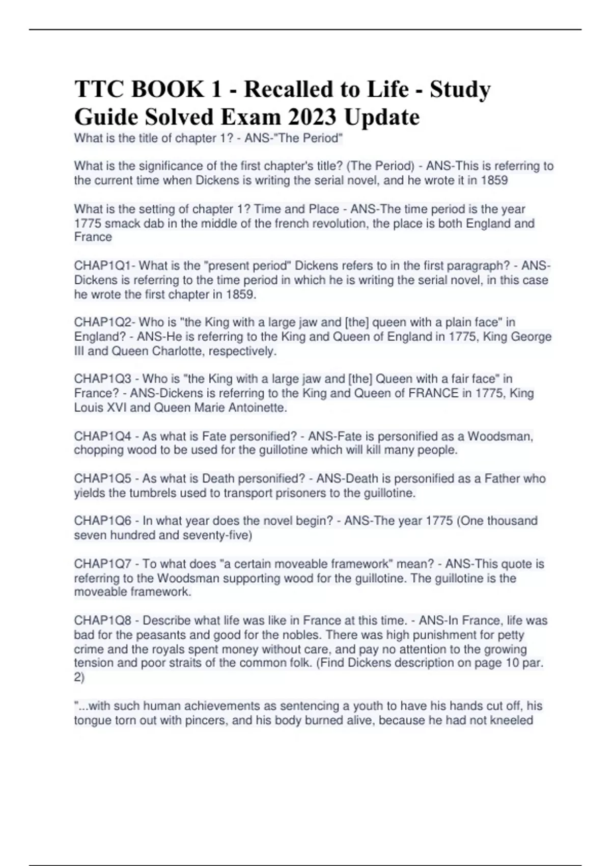TTC BOOK 1 - Recalled to Life - Study Guide Solved Exam 2023 Update