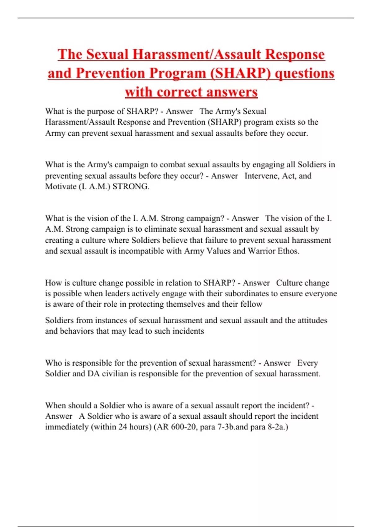 The Sexual Harassment/Assault Response and Prevention Program (SHARP) questions with correct answers