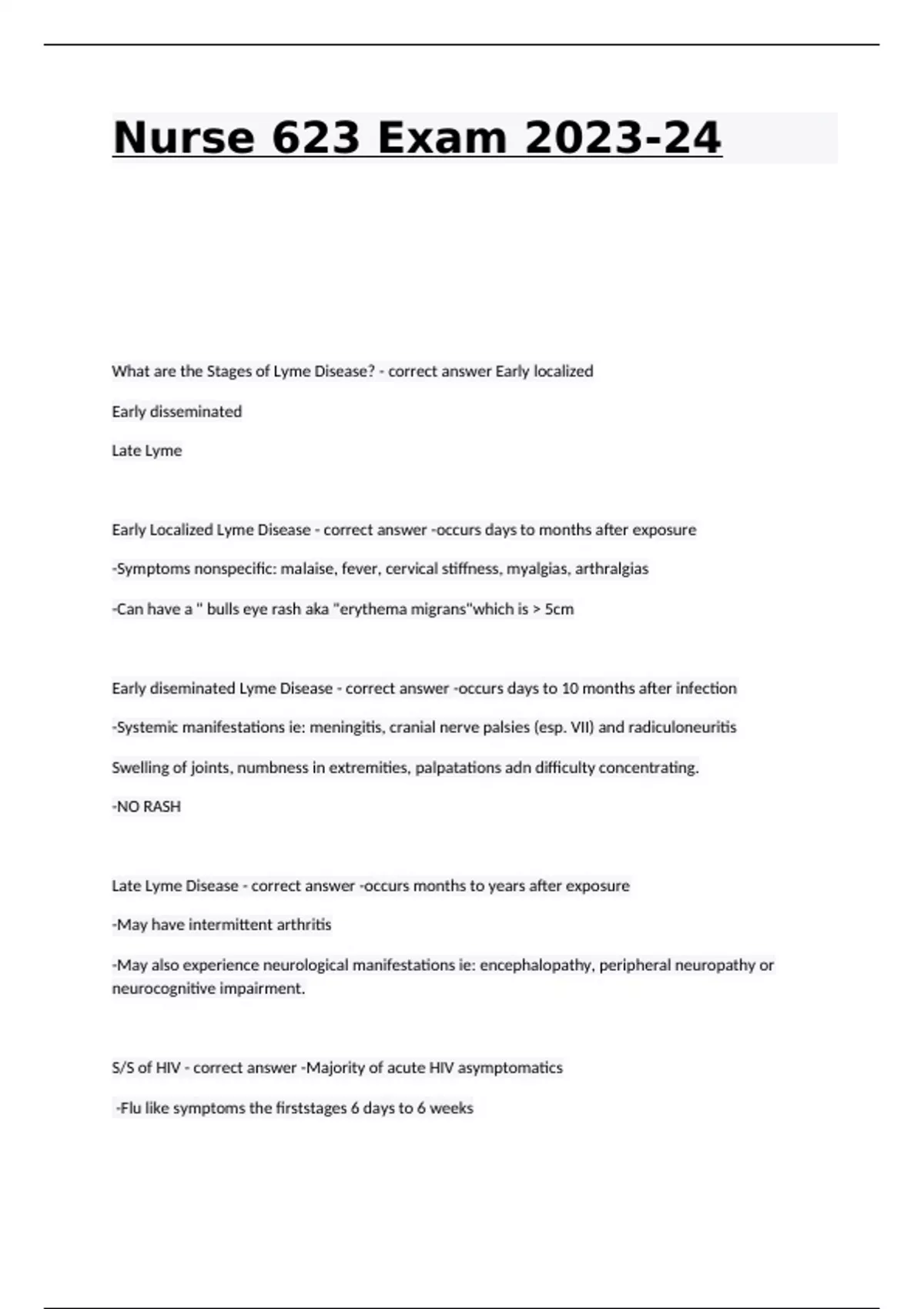 Nurse 623 Exam 2023-24 What are the Stages of Lyme Disease? - correct answer Early localized Early disseminated Late Lyme Early Localized Lyme Disease - correct answer -occurs days to months after exposure -Symptoms nonspecific: malaise, fever, cervical stiffness, myalgias, arthralgias -Can have a " bulls eye rash aka "erythema migrans"which is > 5cm Early diseminated Lyme Disease - correct answer -occurs days to 10 months after infection -Systemic manifestations ie: meningitis, cranial nerve palsies (esp. VII) and radiculoneuritis Swelling of joints, numbness in extremities, palpatations adn difficulty concentrating. -NO RASH Late Lyme Disease - correct answer -occurs months to years after exposure -May have intermittent arthritis -May also experience neurological manifestations ie: encephalopathy, peripheral neuropathy or neurocognitive impairment. S/S of HIV - correct answer -Majority of acute HIV asymptomatics -Flu like symptoms the firststages 6 days to 6 weeks -Fever, sore throat myalgias, headache, cervival lymphadenopathy and nightsweats Risk Factors for HIV - correct answer Sexual history, sexually transmitted disease, substance abuse, transfusion history, infection history and occupation history Hypersensitivity Reactions - correct answer Type 1 Hypersensitivity RX - correct answer Type II Hypersensitivity Rx - correct answer Type III Hypersensitivity RX - correct answer Type IV Hypersensitivity Rx - correct answer MCV - correct answer the size of the RBC MCH - correct answer Volume of RBC MCHC - correct answer the concentration % Normocytic anemia - correct answer MCV 82-92 (normal size) MCH 25-30 (normal color) MCHC 32-36 EX: anemia of chronic disease, sepsis, hemorrhagic, aplastic anemia and heriditary spherocytosis Microcytic Anemia - correct answer " Small light incompetant" MCV<80 (small ) MCH 20-25 (pale) MCHC 27 EX: iron deficiency anemia , Thalassemia Macrocytic Anemia - correct answer " Big Dark Dumb" MCV>96 (large) MCH 30-50 (dark) MCHC 32-36 EX: Pernicious anemia, Vitamin B12 deficiency, folic acid deficiency, Antimetabolite drugs ( methotrexate) Normal H&H Male versus Female - correct answer Male Hgb:13.5-17.5 HCT: 40-54% Female Hgb: 12-15.5 HCT: 36-48% Lupus - correct answer Malaise fevers, unexplained WL, ABD pain, depression, sleeplessness, swelling of the joints Rheumatoid Arthritis - correct answer Early stages: (bilateral )diffuse arthritis, WL, anorexia, and low grade fevers. May also have pain in extremities painful eyes and CP upon inspiration.... ****Joint pain and swelling present on awakening but improves as the day progresses*** Ankylosing Spondylitis - correct answer Pain in the ankeles, eyesm hips, joints, lower back neck or shoulders. Pain during excercise or rest Eyes can be inflammed or red. Visual disturbances or light sensitivity Fatigue, malaise, inflammed tendons, IBD sleep d/o or physical deformities Osteoarthritis - correct answer Eczema S/S - correct answer Early: symmetrical lesions which ooze, crust , and become excoriated occurs in the folds Later: rash become crusted, scaley thickened and lichenified Psoriasis - correct answer Eczema treatment - correct answer Goal: to control S/S because there is no cure ase pruritis nt secondary infection te the patient so they can control the disease themselves hydration er restoring theraphies 6. eliminate triggers Sjogrens Syndrome - correct answer Very challanging to diagnose because symptoms overlap with many other diseases such as MS., Lupus, chronic fatigue and fibromyalgia S/S: dry gritty burning eyes, dry oral cavities/ tongue, increased dental decay, change in taste or smell digestive problems and debilitating fatigue Allergic Dermatitis Acute: - correct answer Acute: weeping lesions with numerous tiny vessicles on a erythematous base that is itchy... may burn or sting. Treatment Goal: Symptom relief calamine lotion, topical steroids and oatmeal baths (Aveeno) **if weeping: moist compresses, simple srying agents and calamien lotion several times per day** Allergic dermatitis severe - correct answer steroid creams possibly po steroids10-14 days taper Patient education Allergic Dermatitis - correct answer -do not stop steroids abruptly if given for > 5 days -identify the cause, avoid exposure, wear gloves and protective clothing, contact provider for exacerbations Cellulitis defination and treatment - correct answer usually staph or strep red, warm, and temder to palpate Cellulitis Treatment: 1.Uncomplicated no bite: dicloxaxillin or cephalexin (Keflex 10-14 days) PCN allergy: Erythromycin 3.Humanand dog bites : Augmentin Abcess definition and treatment - correct answer Folliculitis - correct answer superficial to deep skin infection of the hair follicle with staph or strep Goal: Make skin inhospitable to pathogens Treatment; 1.Wash skin BID with antibacterial soap skin softens open large pustules and trim necrotic tissue 3. Bactroban for secondaryinfected skin lesions ****systemic ABX not advantageous to topical**** Pustule - correct answer elevated lesion semilar to a vessicle but filled with purulent fluid ie: acne, impetigo Macule - correct answer flat circumcised area that is a change in the skin color less than 1 cm. ie: freckle, flat mole petichea Patch - correct answer flat, nonpalpable irregular shaped macule >1cm ie: vitallago, port wine stains, mongolian spots Keloid - correct answer irreg shaped, enlarging scar form excessive collagen formation Papule - correct answer elevated firm circumcised area less <1cm ie: wart, elevated mole, insect bite Eccymoisis - correct answer small hemmoraghic spot round irreg blue or purple patch Hematoma - correct answer localized collection of blood , usually clotted in an organ or space or tissue due to a break in the wall of a blood vessell Acute viral syndrome - correct answer general viral syndrome that has no clear cause S/S: fever, chills, runny nose, cough, sor throat, HA, SOB, wheezing, N./V, decreased appetite. Treatment Antipyuretics: feve