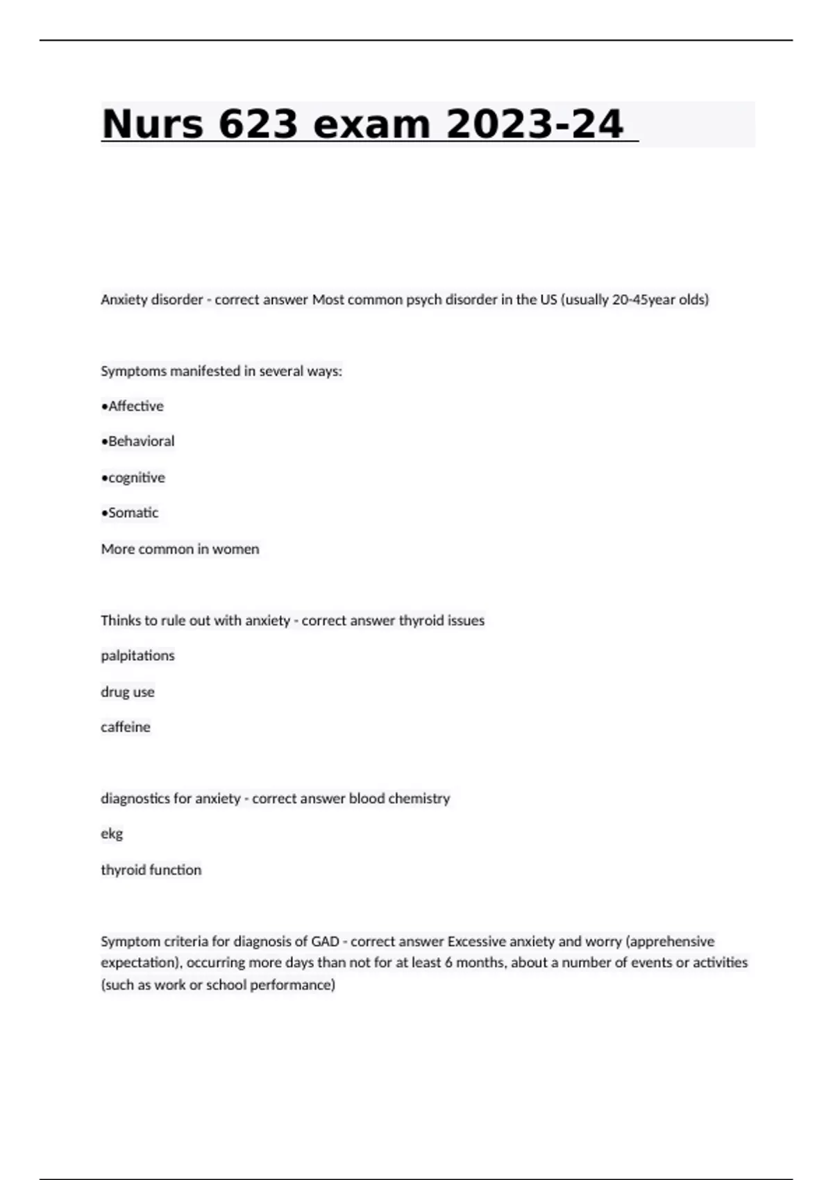 Nurs 623 exam 2023-24 Anxiety disorder - correct answer Most common psych disorder in the US (usually 20-45year olds) Symptoms manifested in several ways: •Affective •Behavioral •cognitive •Somatic More common in women Thinks to rule out with anxiety - correct answer thyroid issues palpitations drug use caffeine diagnostics for anxiety - correct answer blood chemistry ekg thyroid function Symptom criteria for diagnosis of GAD - correct answer Excessive anxiety and worry (apprehensive expectation), occurring more days than not for at least 6 months, about a number of events or activities (such as work or school performance) Clinical Presentation of GAD Excessive anxiety Hyper vigilant Headaches Restlessness Shakiness Hyperactive autonomic symptoms Disrupts life Symptoms for 6 months or more Education for GAD - correct answer •Avoid alcohol and stimulants •Symptom recognition •Symptom interpretation Treatment for GAD - correct answer Non pharmacologic •***Cognitive behavior therapy (CBT) Pharmacology •Anti-anxiety agents (refer to text for list) •Acute: alprazolam and diazepam short term •Long term: SSRIs •*caution in elderly Panic disorder - correct answer An anxiety disorder marked by unpredictable minutes-long episodes of intense dread in which a person experiences terror and accompanying chest pain, choking, or other frightening sensations. Distinguish between disorder and attack •Pattern of recurrent episodes •Sudden onset •Severe symptoms Diagnosis: based on clinical symptoms •Refer to text for symptom criteria Treatment: •SSRI/SNRI or TCA •CBT** PTSD (Post Traumatic Stress Disorder) - correct answer Types PTSD •Acute: <3 months •Chronic: >3 months •Delayed: onset at least 6 months after trauma Clinical •Symptoms are apparent for greater than one month Symptoms: intrusive, avoidant behaviors, hyper arousal. education and treatment for PTSD - correct answer Pharmacology -SSRI -Paroxetine and sertraline -? prazosin Non-pharmacological •CBT and prolonged exposure (PE) •Critical incident debriefing (CID) •Stress inoculation therapy (SIT) •Image rehearsal therapy (IRT) •Psychodynamic Therapy •Family, group, and peer Major depressive disorder - correct answer Characteristics •Severe negative change in mood, thinking, and behavior •Severity •With or without suicide idealization Epidemiology •5-20% of population •Adults >65 (30-40%) •High rate for recurrence •Women > Men •8-19% hospitalized •1 out of 7 suicide •Co-morbid anxiety, cardiac and diabetes Differential diagnosis for major mood disorder - correct answer Thyroid disorder •Sleep disorder •Unrecognized bipolar •Neurological •Medications •Substance use •Adrenal functioning Clinical features of Major depressive disorder - correct answer The DSM-5 symptom criteria for major depression state that five (or more) of the following symptoms have been present during the same 2-week period and represent a change from previous functioning. At least one of the symptoms is either (1) depressed mood or (2) anhedonia, meaning loss of interest or pleasure: • Depressed mood expressed as feelings of sadness or hopelessness. Irritability may be the primary symptom in adolescents and children. • Markedly diminished interest (apathy) in most activities. • Change in appetite. • Insomnia or hypersomnia. • Behavioral agitation or retardation. • Loss of energy. • Feelings of worthlessness or guilt. • Loss of concentration. • Recurrent thoughts of death or suicide. • These symptoms cause significant functional impairment and are not related to a medical illness or from the effects of a substance. Risk factor for major depression - correct answer Age: Adolescent or older adult Gender: Female Family History: Strong family history of depression, suicide or attempt, alcohol abuse, or other substance abuse History: History of migraine headaches, back pain, recent myocardial infarction, and/or peptic ulcer disease Current Medical Condition: Current chronic disease (especially multiple diseases) Lifestyle: Insomnia Stress Poverty Less than high school education Recent traumatic event Parent or caregiver of a child or children with behavioral disorders, especially hyperactivity Retired What are the common presenting symptoms of depression in the geriatric patient? - correct answer •Vegetative—poor appetite, disrupted sleep, early morning awakening •Somatic—pain throughout body or out of proportion with underlying pathology •Psychological—obsessive feelings of guilt and worry, ruminations throughout the night; suicidal ideation; memory problems •Psychomotor— anxiety; psychomotor agitation •Diurnal variation in symptoms—cannot "get moving" in morning, or specific time of day when depression is worst pharmacologic treatment for major depressive disorder - correct answer Selective Serotonin Reuptake Inhibitors (SSRIs) Advise patients that antidepressant effect may take from 4 to 8 weeks (up to 12 weeks) to manifest. SSRIs are also first-line therapy for elderly patients because they have fewer side effects *Contraindications Avoid SSRIs within 14 days of taking an MAOI (serotonin syndrome) • Fluoxetine (Prozac): Longest half-life of all SSRIs and the first SSRI (useful for noncompliant patients) • Paroxetine (Paxil): Shortest half-life • Citalopram (Celexa): Has fewer drug interactions compared with other SSRIs • Escitalopram (Lexapro): Compound derived from citalopram (Celexa) Other SSRIs: Sertraline (Zoloft), fluvoxamine (Luvox postpartum depression - correct answer Recognize it is a real MMD Risk: •Few days after delivery up to six months after childbirth Support groups- can use low dose SSRI's while breastfeeding. How do you assess suicide risk (consider mnemonic SAD PERSONS)? - correct answer • The five basic steps are to clearly define the problem; identify risk and protective factors; develop and test interventions; implement i