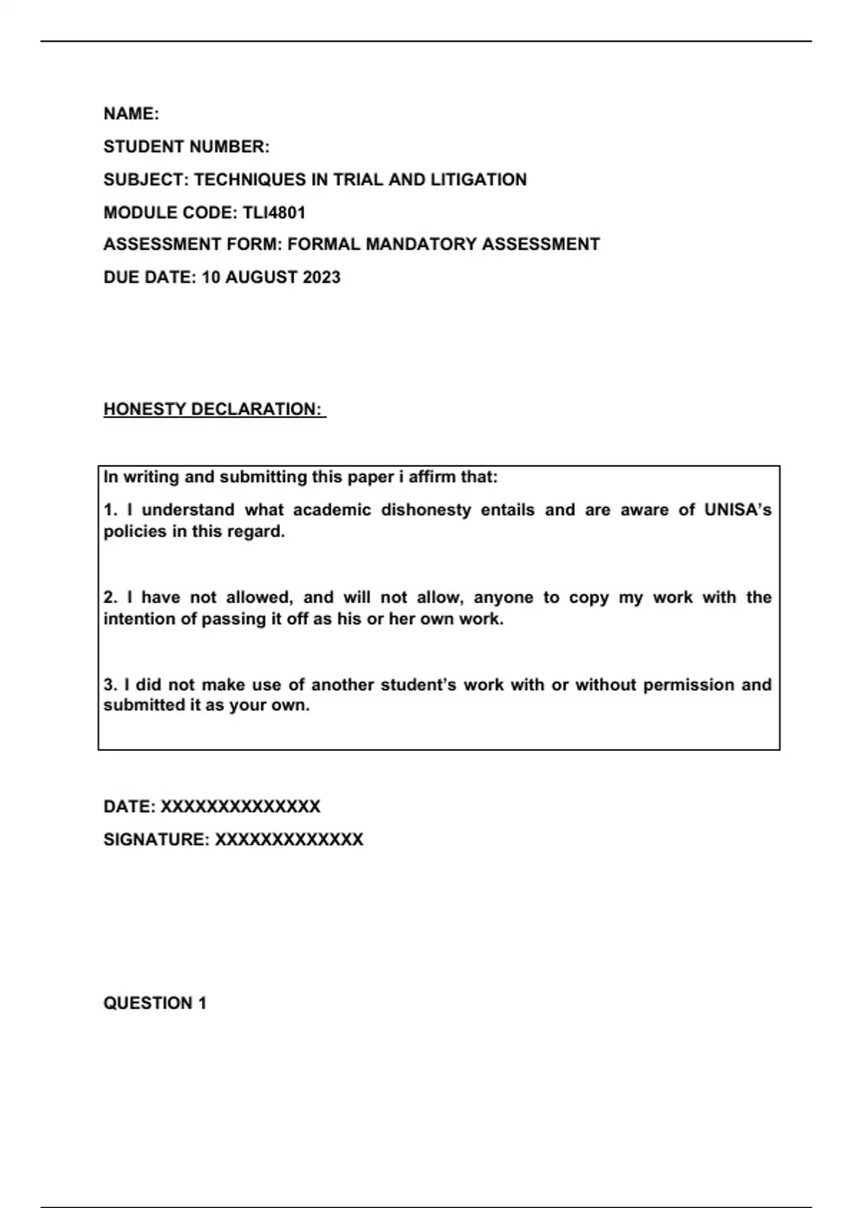 1. I understand what academic dishonesty entails and are aware of UNISA’s