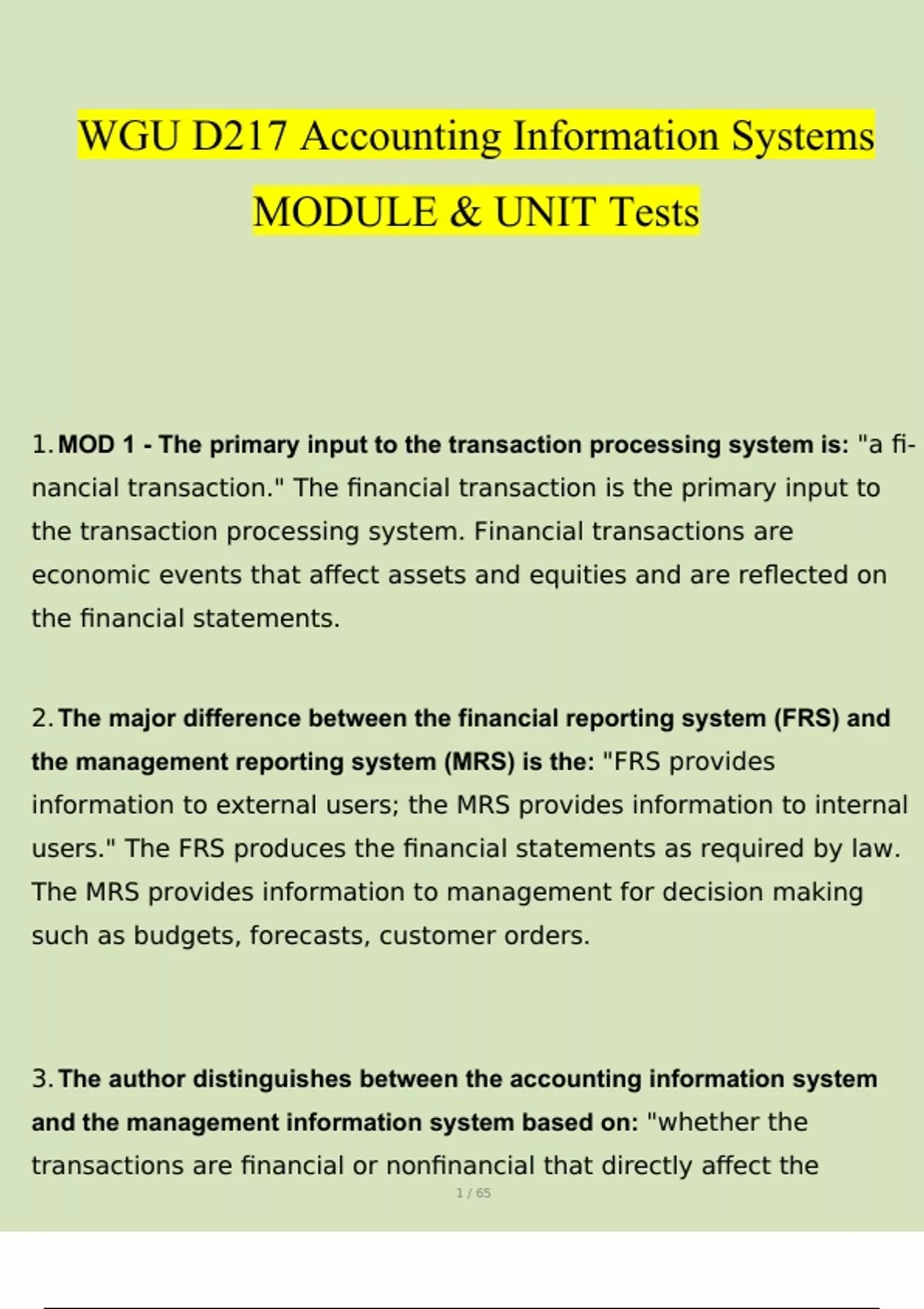 WGU D217 Accounting Information Systems MODULE'S 1 - 14 & UNIT'S 1 - 6 Test's (Verified Answers) WGU D217 Accounting Information Systems MODULE'S 1 - 14 & UNIT'S 1 - 6 Test's (Verified Answers)