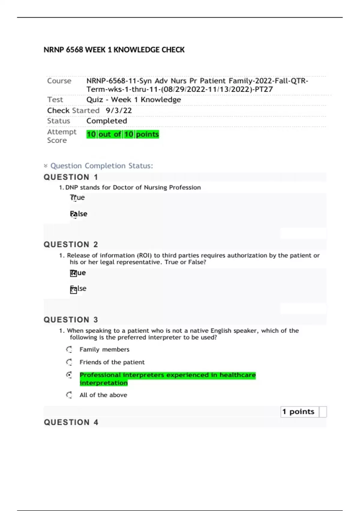 1. Question: DNP stands for Doctor of Nursing Profession 2. Question: Release of information (ROI) to third parties requires authorization by the patient or his or her legal representative. True or False? 3. Question: When speaking to a patient who is not a native English speaker, which of the following is the preferred interpreter to be used? 4. Question: At what level of government is the role of the nurse practitioner defined? 5. Question: An NP must have a DNP to prescribe controlled substances. True or False? 6. Question: Telemedicine is defined as: 7. Question: Different states have different titles for NPs. All of the following are recognized titles for Nurse Practitioners EXCEPT: How is the NP titled in your state? Also list the titles for NPs in two neighboring states. 8. Question: All states require NPs to take and pass a national certification exam. True or False? 9. Question: If an NP is at a social gathering and someone casually asks his/her medical opinion, that NP could be liable if something goes wrong. True or false? 10. Question: What are the main benefits to the NP of NP practice ownership?