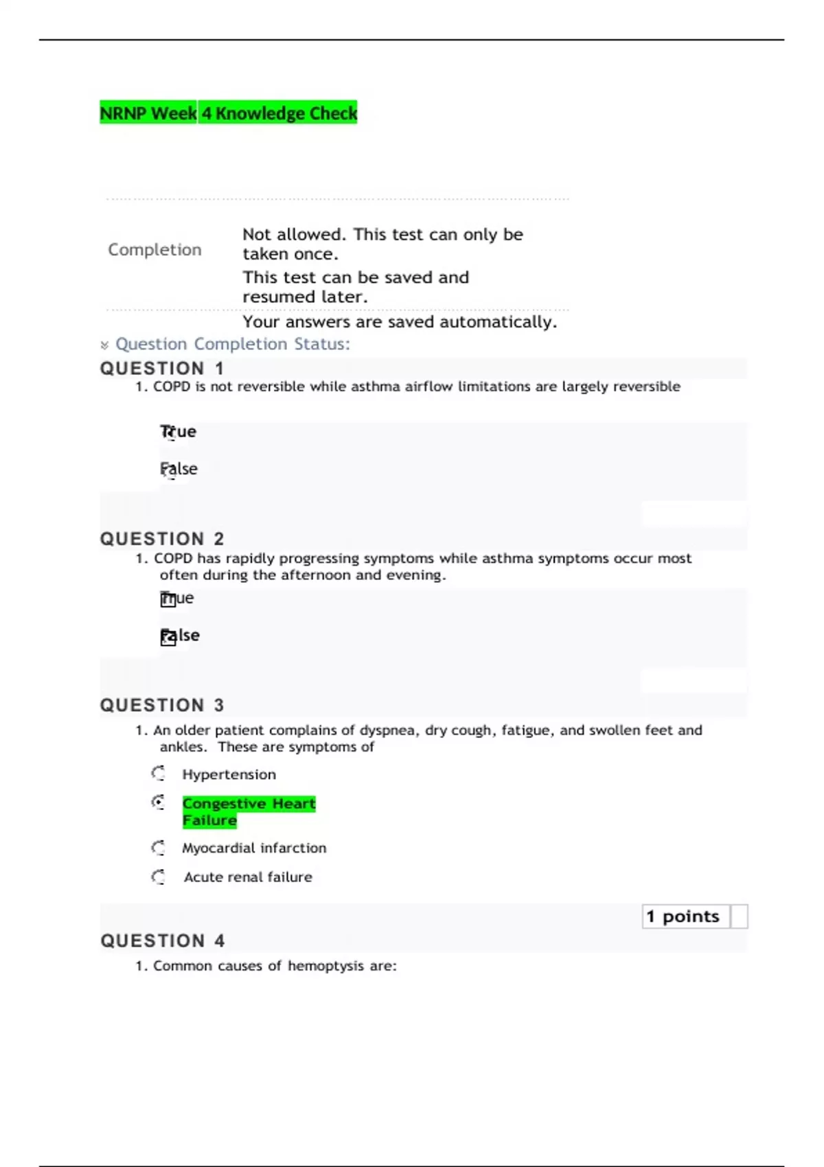 1. Question: COPD is not reversible while asthma airflow limitations are largely reversible. 2. Question: COPD has rapidly progressing symptoms while asthma symptoms occur most often during the afternoon and evening. 3. Question: An older patient complains of dyspnea, dry cough, fatigue, and swollen feet and ankles. These are symptoms of: 4. Question: Common causes of hemoptysis are: 5. Question: Normal pulse oximetry for 18-year-old is ___________. 6. Question: How would you interpret this EKG? 7. Question: All are a risk factor for COPD except: 8. Question: What is the most common imaging study ordered for screening and initial confirmation of an abdominal aortic aneurysm? 9. Question: In patients with hypertension, salt should be restricted to a maximum of grams per day. 10. Question: How would you interpret this EKG?