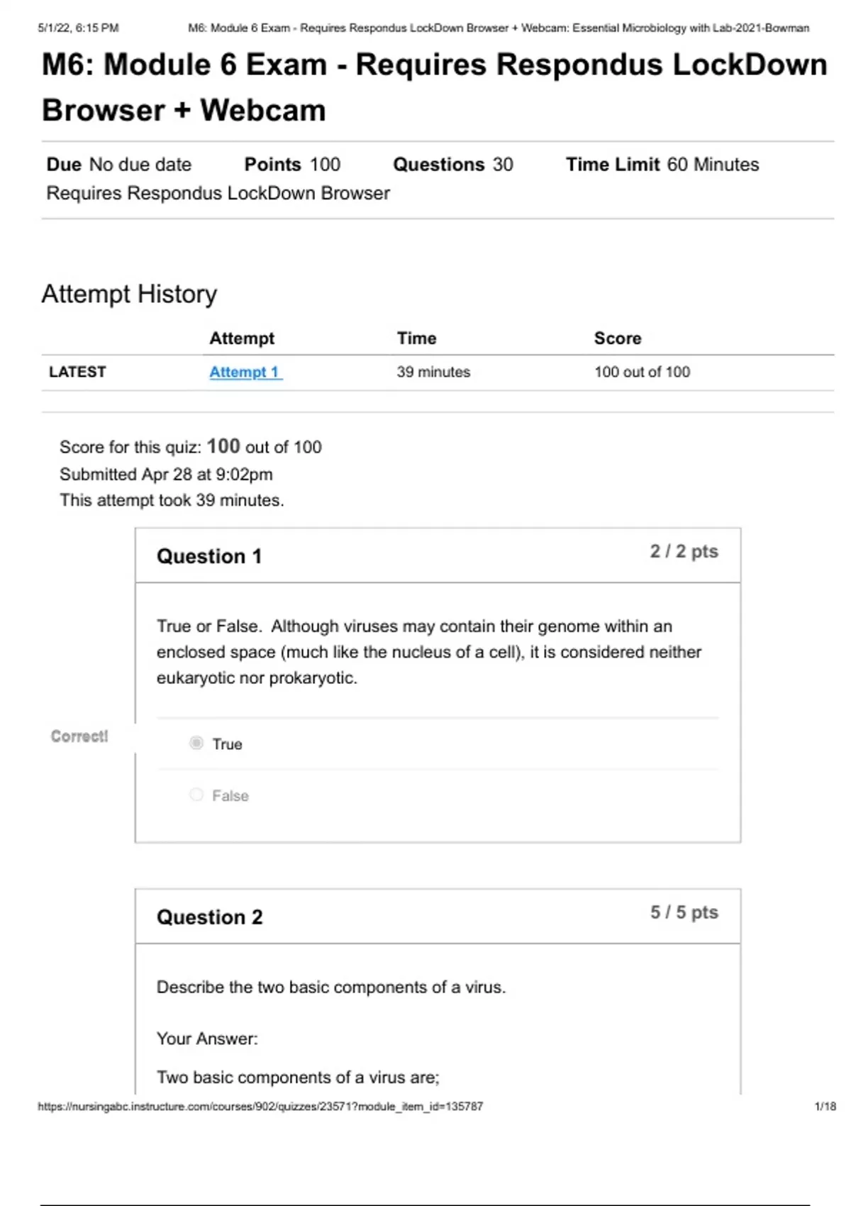 , 5/1/22, 6:15 PM M6: Module 6 Exam - Requires Respondus LockDown Browser + Webcam: Essential Microbiology with Lab-2021-Bowman
