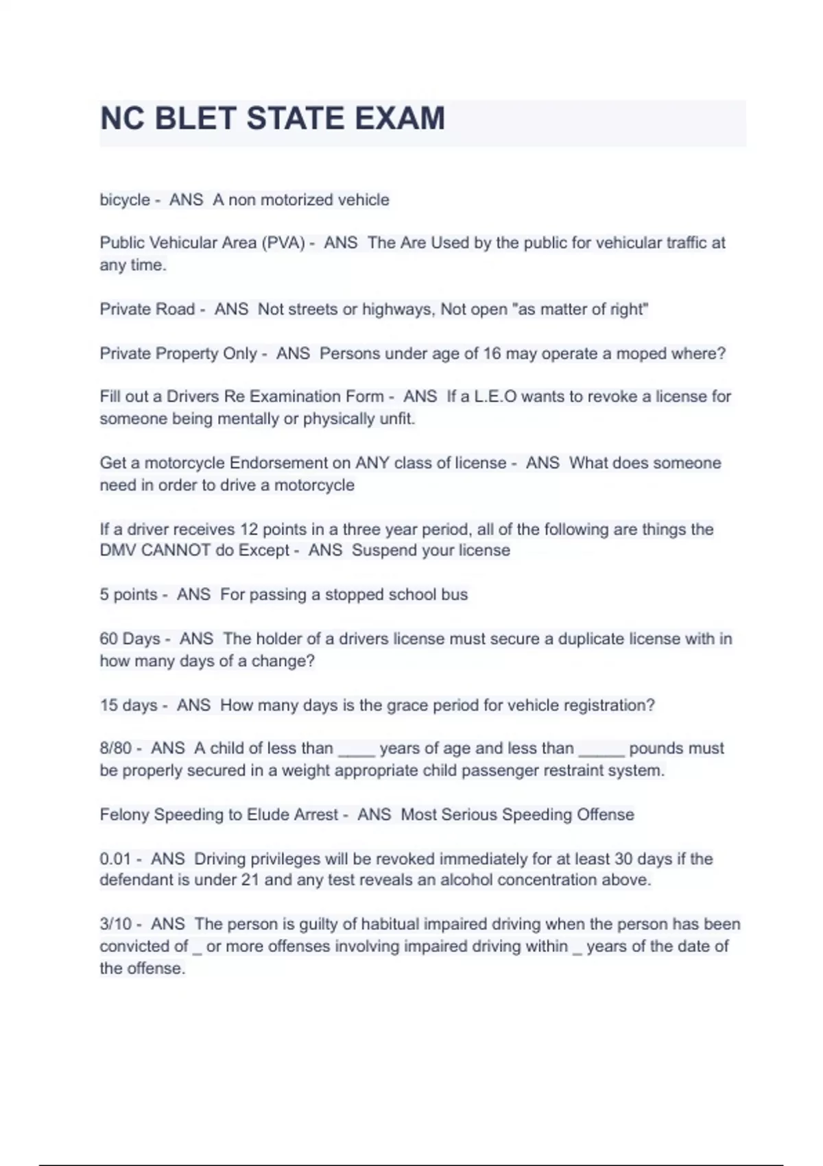 NC BLET STATE EXAM QUESTIONS WITH SOLUTIONS bicycle - ANS A non motorized vehicle Public Vehicular Area (PVA) - ANS The Are Used by the public for vehicular traffic at any time. Private Road - ANS Not streets or highways, Not open "as matter of right" Private Property Only - ANS Persons under age of 16 may operate a moped where? Fill out a Drivers Re Examination Form - ANS If a L.E.O wants to revoke a license for someone being mentally or physically unfit. Get a motorcycle Endorsement on ANY class of license - ANS What does someone need in order to drive a motorcycle If a driver receives 12 points in a three year period, all of the following are things the DMV CANNOT do Except - ANS Suspend your license 5 points - ANS For passing a stopped school bus 60 Days - ANS The holder of a drivers license must secure a duplicate license with in how many days of a change? 15 days - ANS How many days is the grace period for vehicle registration? 8/80 - ANS A child of less than ____ years of age and less than _____ pounds must be properly secured in a weight appropriate child passenger restraint system. Felony Speeding to Elude Arrest - ANS Most Serious Speeding Offense 0.01 - ANS Driving privileges will be revoked immediately for at least 30 days if the defendant is under 21 and any test reveals an alcohol concentration above. 3/10 - ANS The person is guilty of habitual impaired driving when the person has been convicted of _ or more offenses involving impaired driving within _ years of the date of the offense. Vigilance Problems - ANS - driving in opposing lanes or wrong way on a one-way street - slow response to traffic signals - slow or failure to respond to officer's signals - stopping in lane for no apparent reason - driving without headlights - failure to signal or signal inconsistent with action Check stations and roadblocks - ANS Used to produce driver's license, registration, and proof of insurance.