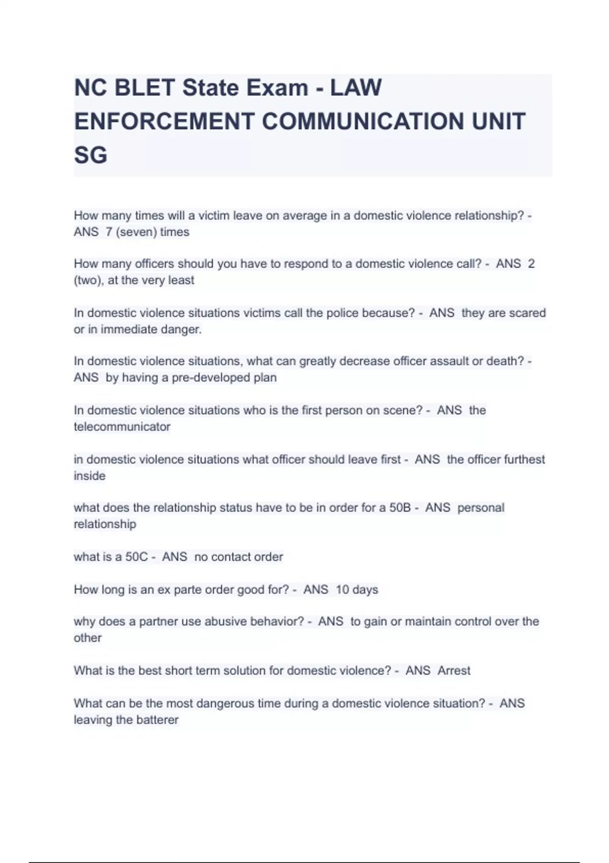 NC BLET State Exam - LAW ENFORCEMENT COMMUNICATION UNIT SG QUESTIONS WITH VERIFIED ANSWERS 2023 How many times will a victim leave on average in a domestic violence relationship? - ANS 7 (seven) times How many officers should you have to respond to a domestic violence call? - ANS 2 (two), at the very least In domestic violence situations victims call the police because? - ANS they are scared or in immediate danger. In domestic violence situations, what can greatly decrease officer assault or death? - ANS by having a pre-developed plan In domestic violence situations who is the first person on scene? - ANS the telecommunicator in domestic violence situations what officer should leave first - ANS the officer furthest inside what does the relationship status have to be in order for a 50B - ANS personal relationship what is a 50C - ANS no contact order How long is an ex parte order good for? - ANS 10 days why does a partner use abusive behavior? - ANS to gain or maintain control over the other What is the best short term solution for domestic violence? - ANS Arrest What can be the most dangerous time during a domestic violence situation? - ANS leaving the batterer mental illness: loss of contact with reality is? - ANS psychosis Mental Illness: What term refers to loss of hope? - ANS Depression mental illness: what does ELEAP stand for? - ANS engage, listen, empathize, agree, partner. What is an officers primary tool? - ANS Communication What involves observing behavior, being aware of tone of voice, and actively listening? - ANS Reading What should you make sure to never do when talking to the public? - ANS Use profanity Nonverbal cues amount to what percent of communication? - ANS 90%