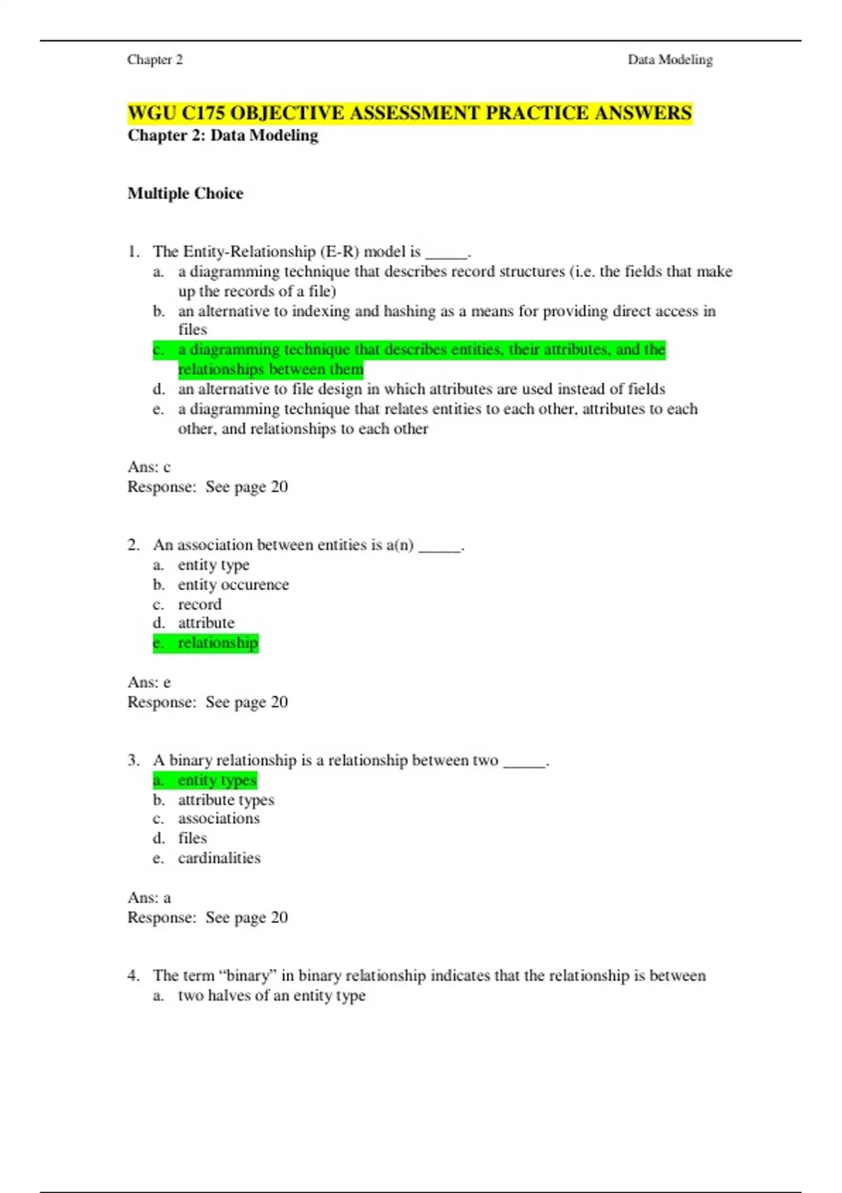WGU C175 OBJECTIVE ASSESSMENT PRACTICE TEST ANSWER 1. The Entity-Relationship (E-R) model is _____. a. a diagramming technique that describes record structures (i.e. the fields that make up the records of a file) b. an alternative to indexing and hashing as a means for providing direct access in files c. a diagramming technique that describes entities, their attributes, and the relationships between them d. an alternative to file design in which attributes are used instead of fields e. a diagramming technique that relates entities to each other, attributes to each other, and relationships to each other 2. An association between entities is a(n) _____. a. entity type b. entity occurence c. record d. attribute e. relationship 3. A binary relationship is a relationship between two _____. a. entity types b. attribute types c. associations d. files e. cardinalities 4. The term “binary” in binary relationship indicates that the relationship is between a. two halves of an entity type b. two entity types c. two divisions of an entity’s attributes d. two attributes e. two relationships 5. The cardinality of a relationship is _____. a. The minimum number of entities that can be involved in the relationship. b. The maximum number of entities that can be involved in the relationship. c. The minimum number of attributes that can be in the entity types in a relationship. d. The maximum number of attributes that can be in the entity types in a relationship. e. The minimum number of associations that can be involved in the relationship. 6. The modality of a relationship is _____. a. The minimum number of entities that can be involved in the relationship. b. The maximum number of entities that can be involved in the relationship. c. The minimum number of attributes that can be in the entity types in a relationship. d. The maximum number of attributes that can be in the entity types in a relationship. e. The minimum number of associations that can be involved in the relationship. 7. A one-to-one binary relationship _____. a. involves a single entity type b. involves two entity types c. allows an occurrence of one entity type to be associated with several occurrences of another entity type d. allows an occurrence of one entity type to be associated with several occurrences of another entity type and vice versa e. restricts the number of attributes that an entity has 8. A one-to-many binary relationship allows an occurrence of the entity type on the “one side” of the relationship to be associated with _____. a. a single occurrence of the same entity type b. multiple occurrences of the same entity type c. a single occurrence of the entity type on the “many side” of the relationship d. multiple occurrences of the entity type on the “many side” of the relationship e. multiple occurrences of the entity type on the “one side” of the relationship 9. A many-to-many binary relationship allows an occurrence of one entity type to be associated with _____. a. a single occurrence of the same entity type b. multiple occurrences of the same entity type c. a single occurrence of another entity type d. multiple occurrences of another entity type e. multiple occurrences of three entity types 10. A business school’s faculty parking lot has assigned parking spaces. Each professor is entitled to one parking space. This is an example of a _____ relationship. a. one-to-one binary b. one-to-many binary c. many-to-many binary d. one-to-one unary e. one-to-many unary 11. Each building on a university campus has several faculty offices. Each professor has one office. The relationship between campus buildings and professors is a _____ relationship. a. one-to-one binary b. one-to-many binary c. many-to-many binary d. one-to-one unary e. one-to-many unary 12. In a university, the relationship between courses and their sections can best be described as a _____ relationship. a. one-to-one binary b. one-to-many binary (Because a section can NOT have many courses. Think .xls) c. many-to-many binary d. one-to-one unary e. one-to-many unary 13. In a university setting, the relationship between students and the professors who have been their instructors is a _____ relationship. a. one-to-one binary b. one-to-many binary (NOTE: “who have been their instructors”) c. many-to-many binary d. one-to-one unary e. one-to-many unary 14. Intersection data _____. a. is an attribute of the entity on the “one side” of a one-to-many relationship b. is an attribute of the entity on the “many side” of a one-to-many relationship c. describes the relationship between two entities in a many-to-many relationship d. describes one of the entities in a many-to-many relationship e. describes one of the entities in a ternary relationship 15. Each student at a university takes many courses; each course is taken by many students. The semester that a student took a course and the grade that the student received in the course is called _____ data. a. index b. key c. pointer d. direct access e. intersection 16. An associative entity is an alternate way of expressing a(n) _____. a. one-to-one binary relationship b. one-to-many binary relationship c. many-to-many binary relationship d. entity that has no attributes other than the unique identifier or key e. entity that has no unique identifiers or keys 17. A one-to-one unary relationship _____. a. involves a single entity type b. involves two entity types c. allows an occurrence of one entity type to be associated with several occurrences of another entity type d. allows an occurrence of one entity type to be associated with several occurrences of another entity type and vice versa e. allows an occurrence of one entity type to be associated with several occurrences of the same entity type 18. A one-to-many unary relationship allows an occurrence of the entity type on the “one side” of the relationship to be associated with _____. a. a single occurrence of the same entity type b. multi