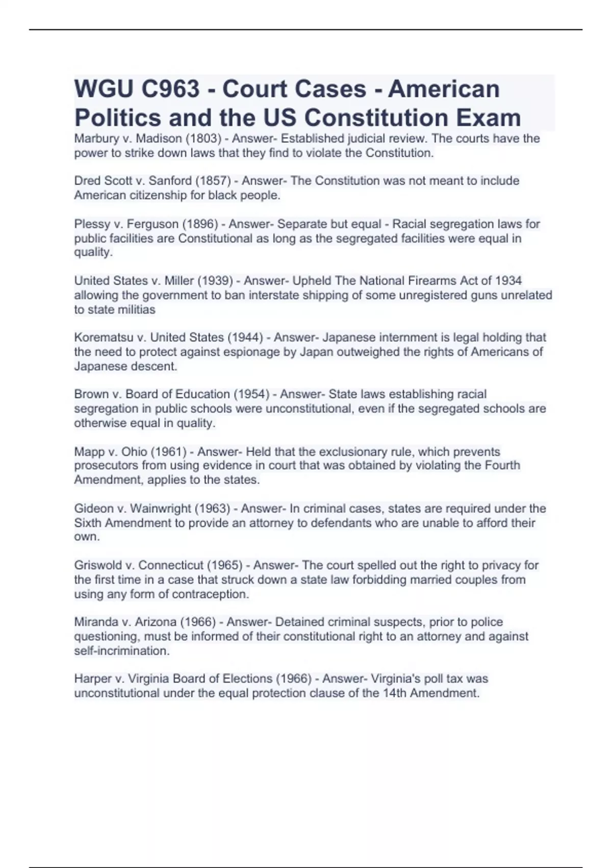 WGU C963 - Court Cases - American Politics and the US Constitution Exam