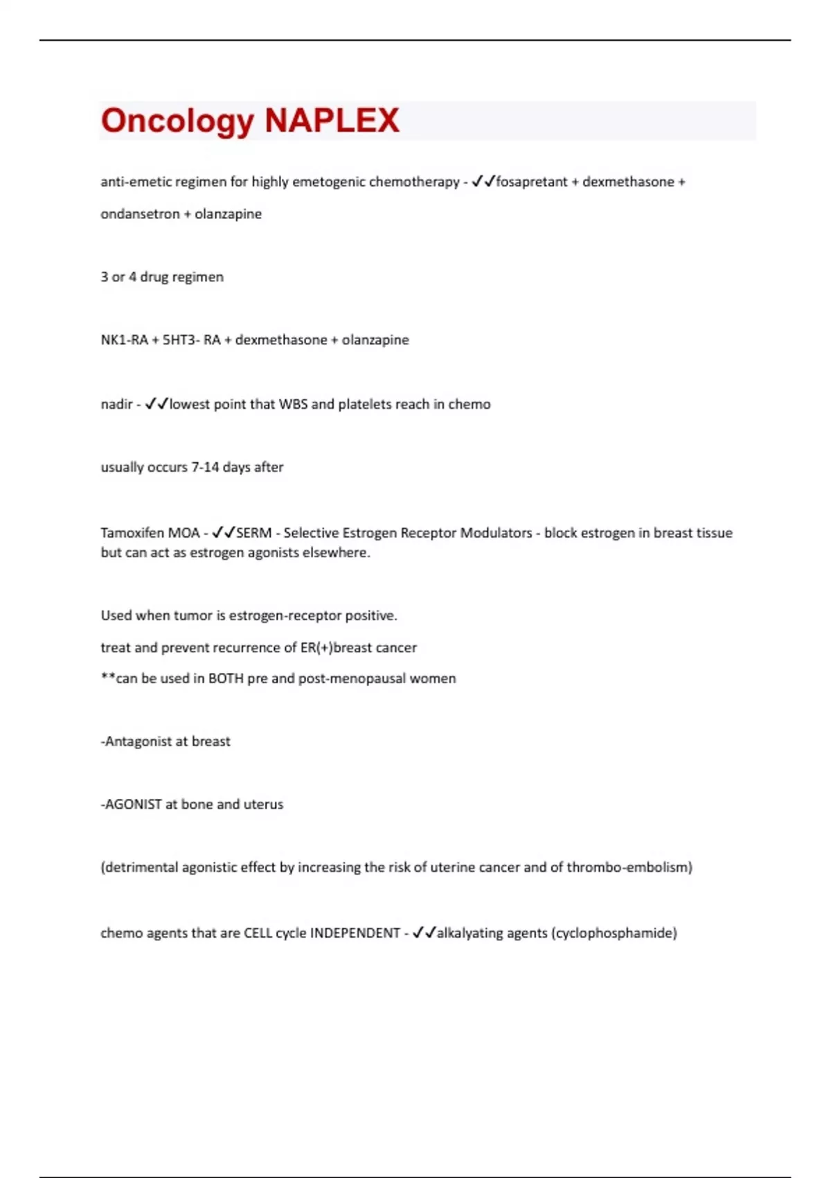 anti-emetic regimen for highly emetogenic chemotherapy - fosapretant + dexmethasone + ondansetron + olanzapine 3 or 4 drug regimen NK1-RA + 5HT3- RA + dexmethasone + olanzapine nadir - lowest point that WBS and platelets reach in chemo usually occurs 7-14 days after Tamoxifen MOA - SERM - Selective Estrogen Receptor Modulators - block estrogen in breast tissue but can act as estrogen agonists elsewhere. Used when tumor is estrogen-receptor positive. treat and prevent recurrence of ER(+)breast cancer **can be used in BOTH pre and post-menopausal women -Antagonist at breast -AGONIST at bone and uterus (detrimental agonistic effect by increasing the risk of uterine cancer and of thrombo-embolism) chemo agents that are CELL cycle INDEPENDENT - alkalyating agents (cyclophosphamide)anthracycline agents (doxorubicin) platinum agents (cisplatin) Zofran MOA - 5HT3 antagonist (-) Amofostine (ethiyol) - given with cisplatin to reduce risk of renal toxicities -given prophylactically with hydration Neupogen - (Filgrastim) Colony stimulating factor Stimulates neutrophil production; decreases infection in neutropenic pts IV, subcut SEs: Splenic rupture, ARDS, allergic rxn, medullary bone pain NCs: do not admin w/in 24 hrs either side of chemo Bone pain is common SE, mgmt w opioids if necc Pegfilgrastim - Neulasta Hematopoietic Agent/Colony Stimulating Factor Given once (t1/2 14 days)Prostate cancer screening - digital rectal exam