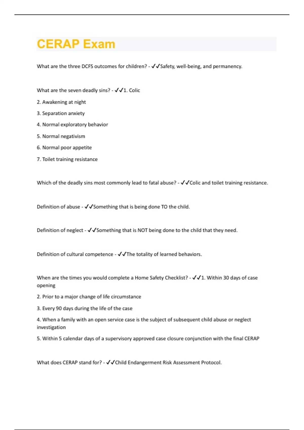 What are the three DCFS outcomes for children? - Safety, well-being, and permanency. What are the seven deadly sins? - 1. Colic 2. Awakening at night 3. Separation anxiety 4. Normal exploratory behavior 5. Normal negativism 6. Normal poor appetite 7. Toilet training resistance Which of the deadly sins most commonly lead to fatal abuse? - Colic and toilet training resistance. Definition of abuse - Something that is being done TO the child. Definition of neglect - Something that is NOT being done to the child that they need. Definition of cultural competence - The totality of learned behaviors. When are the times you would complete a Home Safety Checklist? - 1. Within 30 days of case opening 2. Prior to a major change of life circumstance 3. Every 90 days during the life of the case 4. When a family with an open service case is the subject of subsequent child abuse or neglect investigation 5. Within 5 calendar days of a supervisory approved case closure conjunction with the final CERAP What does CERAP stand for? - Child Endangerment Risk Assessment Protocol.What is the CERAP? - A life of the case assessment designed to provide workers with a mechanism to quickly assessing the potential for moderate to severe harm immediately or in the near future and for taking quick action to protect children. What are the four steps to protecting children? - 1. Information gathering 2. Information analysis 3. Drawings conclusions 4. Making decisions What are the contents of the protocol? - 1. Safety determination form (safety assessment) 2. Safety plan 3. Practice guidelines Define safety - After you've considered vulnerability and 16 safety threats, it is determined that a child in a household or in custodial care is not likely to be moderately or severely harmed immediately or in the near future.