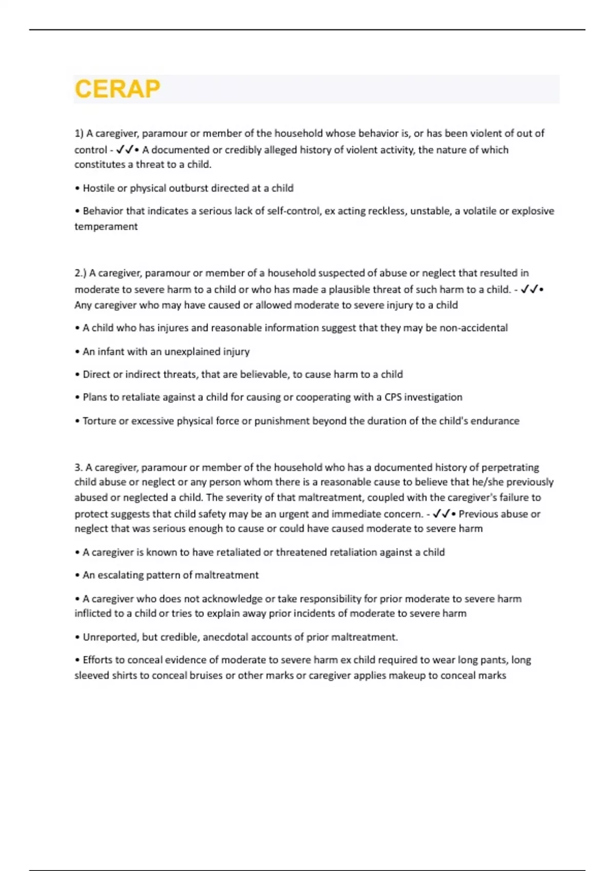 1) A caregiver, paramour or member of the household whose behavior is, or has been violent of out of control - • A documented or credibly alleged history of violent activity, the nature of which constitutes a threat to a child. • Hostile or physical outburst directed at a child • Behavior that indicates a serious lack of self-control, ex acting reckless, unstable, a volatile or explosive temperament 2.) A caregiver, paramour or member of a household suspected of abuse or neglect that resulted in moderate to severe harm to a child or who has made a plausible threat of such harm to a child. - • Any caregiver who may have caused or allowed moderate to severe injury to a child • A child who has injures and reasonable information suggest that they may be non-accidental • An infant with an unexplained injury • Direct or indirect threats, that are believable, to cause harm to a child • Plans to retaliate against a child for causing or cooperating with a CPS investigation • Torture or excessive physical force or punishment beyond the duration of the child's endurance 3. A caregiver, paramour or member of the household who has a documented history of perpetrating child abuse or neglect or any person whom there is a reasonable cause to believe that he/she previously abused or neglected a child. The severity of that maltreatment, coupled with the caregiver's failure to protect suggests that child safety may be an urgent and immediate concern. - • Previous abuse or neglect that was serious enough to cause or could have caused moderate to severe harm • A caregiver is known to have retaliated or threatened retaliation against a child • An escalating pattern of maltreatment • A caregiver who does not acknowledge or take responsibility for prior moderate to severe harm inflicted to a child or tries to explain away prior incidents of moderate to severe harm • Unreported, but credible, anecdotal accounts of prior maltreatment. • Efforts to conceal evidence of moderate to severe harm ex child required to wear long pants, long sleeved shirts to conceal bruises or other marks or caregiver applies makeup to conceal marks4. Child sexual abuse is suspected and circumstances suggest that child safety may be an immediate concern - • A child forced or encouraged to engage in sexual performance or activity including ex sexually gratifying a caregiver or others • A possible or confirmed perpetrator who continues to have access to a child • The caregiver does not believe or support the allegation of sexual abuse made by a child the child is allowed or forced to watch or read pornographic materials 5.a caregiver or paramour or member of the household is hiding the child, refuses access or there is some indication that a caregiver may flee with the child - • a family has previously fled in response to a CPS or police investigation