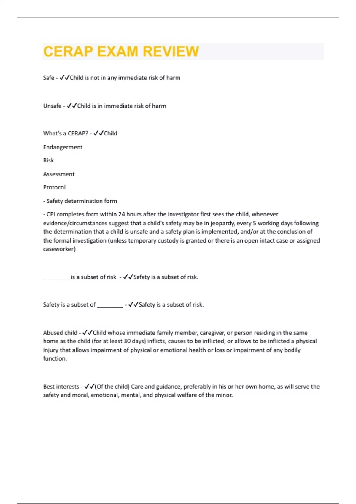 Safe - Child is not in any immediate risk of harm Unsafe - Child is in immediate risk of harm What's a CERAP? - Child Endangerment Risk Assessment Protocol - Safety determination form - CPI completes form within 24 hours after the investigator first sees the child, whenever evidence/circumstances suggest that a child's safety may be in jeopardy, every 5 working days following the determination that a child is unsafe and a safety plan is implemented, and/or at the conclusion of the formal investigation (unless temporary custody is granted or there is an open intact case or assigned caseworker) ________ is a subset of risk. - Safety is a subset of risk. Safety is a subset of ________ - Safety is a subset of risk. Abused child - Child whose immediate family member, caregiver, or person residing in the same home as the child (for at least 30 days) inflicts, causes to be inflicted, or allows to be inflicted a physical injury that allows impairment of physical or emotional health or loss or impairment of any bodily function. Best interests - (Of the child) Care and guidance, preferably in his or her own home, as will serve the safety and moral, emotional, mental, and physical welfare of the minor.Caregiver - Individual 21 or older whom is directly responsible for the care of a child. (ex. teacher, neighbor, nanny, camp counselor) Child - Person under the age of 18. What is the legal age of consent? - 17 Concurrent Planning - Process by which the child welfare professional develops a plan and works toward family reunification while, at the same time, developing an alternative plan for a target case for a child who has been identified as unlikely to be reunified with its parents, in an effort to provide a permanent home for the child. Degree of harm - The severity of harm which could range from slight (low) to moderate to severe.