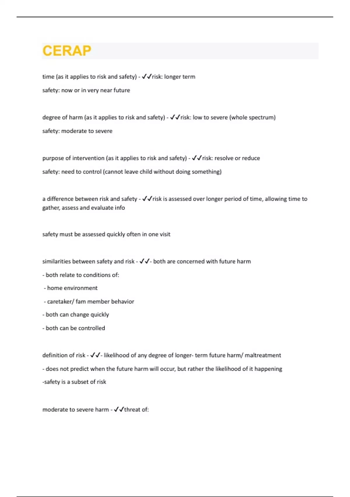 time (as it applies to risk and safety) - risk: longer term safety: now or in very near future degree of harm (as it applies to risk and safety) - risk: low to severe (whole spectrum) safety: moderate to severe purpose of intervention (as it applies to risk and safety) - risk: resolve or reduce safety: need to control (cannot leave child without doing something) a difference between risk and safety - risk is assessed over longer period of time, allowing time to gather, assess and evaluate info safety must be assessed quickly often in one visit similarities between safety and risk - - both are concerned with future harm - both relate to conditions of: - home environment - caretaker/ fam member behavior - both can change quickly - both can be controlled definition of risk - - likelihood of any degree of longer- term future harm/ maltreatment - does not predict when the future harm will occur, but rather the likelihood of it happening -safety is a subset of risk moderate to severe harm - threat of:-danger to child's health/ safety - impairment to his/her physical or mental well-being -disfigurement - in most cases, any abuse that leaves marks on the body definition of safety - - a child is considered safe when an assessment of available info supports the belief that a child is not in immediate (or near future) danger of moderate to severe harm