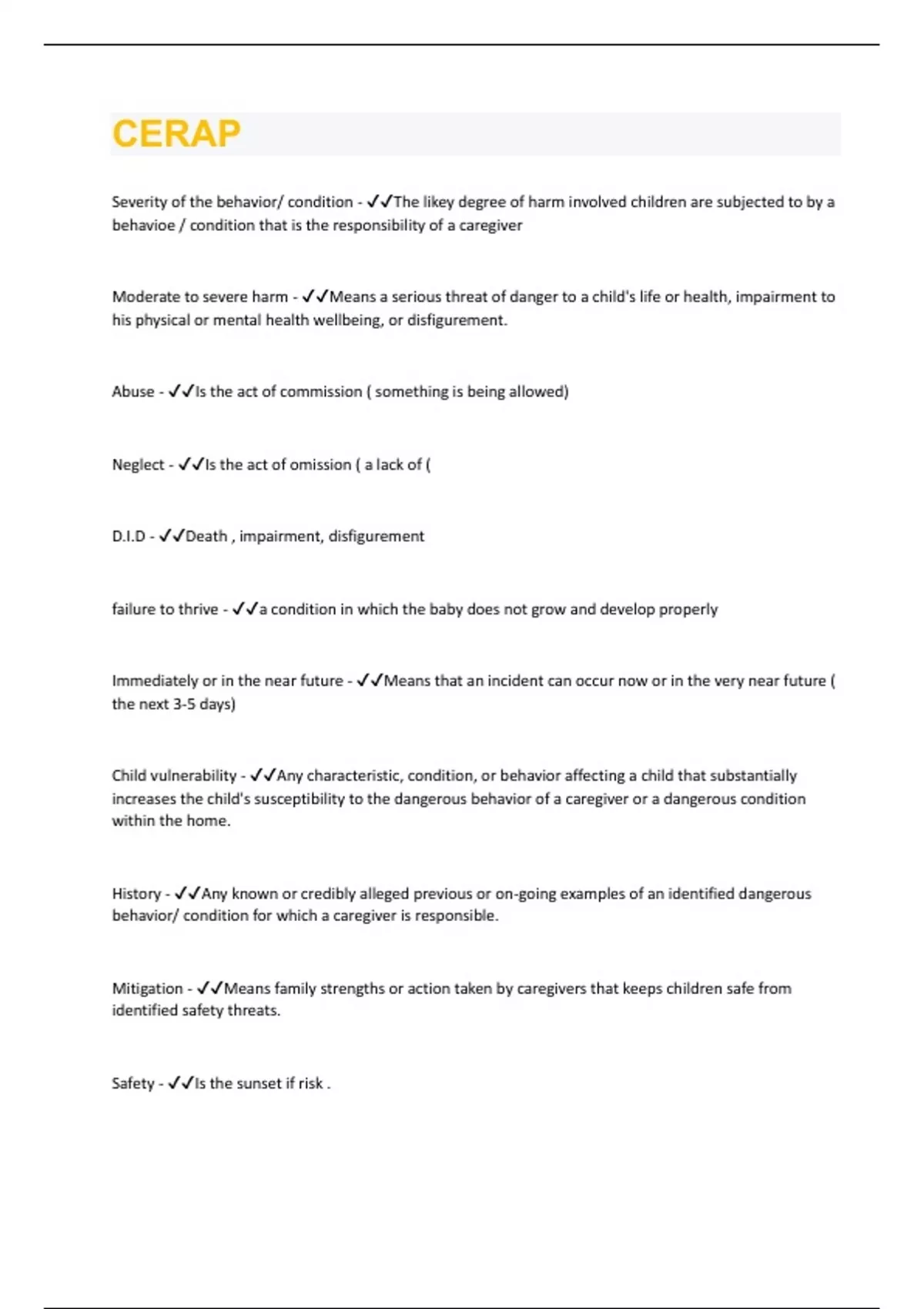 Severity of the behavior/ condition - The likey degree of harm involved children are subjected to by a behavioe / condition that is the responsibility of a caregiver Moderate to severe harm - Means a serious threat of danger to a child's life or health, impairment to his physical or mental health wellbeing, or disfigurement. Abuse - Is the act of commission ( something is being allowed) Neglect - Is the act of omission ( a lack of ( D.I.D - Death , impairment, disfigurement failure to thrive - a condition in which the baby does not grow and develop properly Immediately or in the near future - Means that an incident can occur now or in the very near future ( the next 3-5 days) Child vulnerability - Any characteristic, condition, or behavior affecting a child that substantially increases the child's susceptibility to the dangerous behavior of a caregiver or a dangerous condition within the home. History - Any known or credibly alleged previous or on-going examples of an identified dangerous behavior/ condition for which a caregiver is responsible. Mitigation - Means family strengths or action taken by caregivers that keeps children safe from identified safety threats. Safety - Is the sunset if risk .Safety plan - A voluntary, temporary, short- term plan designed to control serious and immediate threats to children's safety