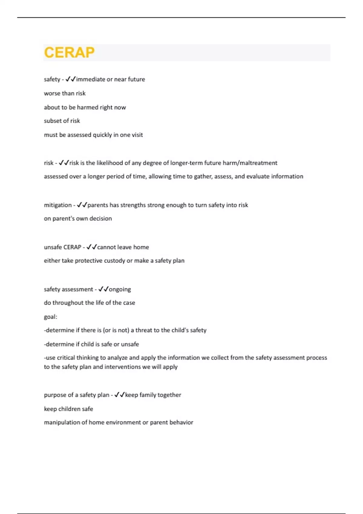afety - immediate or near future worse than risk about to be harmed right now subset of risk must be assessed quickly in one visit risk - risk is the likelihood of any degree of longer-term future harm/maltreatment assessed over a longer period of time, allowing time to gather, assess, and evaluate information mitigation - parents has strengths strong enough to turn safety into risk on parent's own decision unsafe CERAP - cannot leave home either take protective custody or make a safety plan safety assessment - ongoing do throughout the life of the case goal: -determine if there is (or is not) a threat to the child's safety -determine if child is safe or unsafe -use critical thinking to analyze and apply the information we collect from the safety assessment process to the safety plan and interventions we will apply purpose of a safety plan - keep family together keep children safe manipulation of home environment or parent behaviordifferences between safety and risk - time: