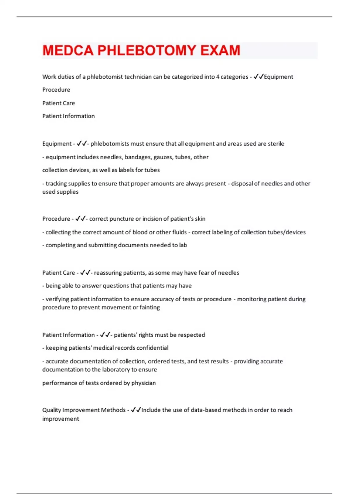 Work duties of a phlebotomist technician can be categorized into 4 categories - Equipment Procedure Patient Care Patient Information Equipment - - phlebotomists must ensure that all equipment and areas used are sterile - equipment includes needles, bandages, gauzes, tubes, other collection devices, as well as labels for tubes - tracking supplies to ensure that proper amounts are always present - disposal of needles and other used supplies Procedure - - correct puncture or incision of patient's skin - collecting the correct amount of blood or other fluids - correct labeling of collection tubes/devices - completing and submitting documents needed to lab Patient Care - - reassuring patients, as some may have fear of needles - being able to answer questions that patients may have - verifying patient information to ensure accuracy of tests or procedure - monitoring patient during procedure to prevent movement or fainting Patient Information - - patients' rights must be respected - keeping patients' medical records confidential - accurate documentation of collection, ordered tests, and test results - providing accurate documentation to the laboratory to ensure performance of tests ordered by physician Quality Improvement Methods - Include the use of data-based methods in order to reach improvementInclude flow charts and pareto charts Flowchart - - used to break out components into diagrams in order to understand a process