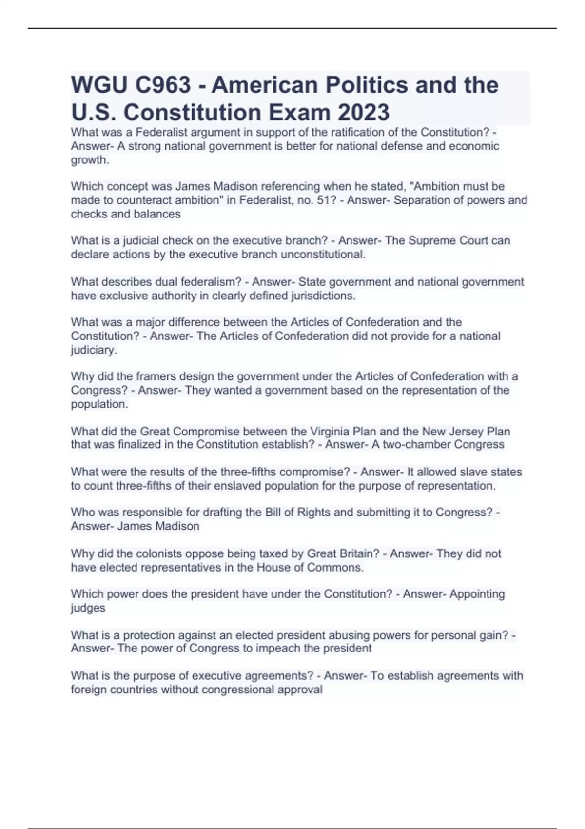 WGU C963 - American Politics and the U.S. Constitution Exam 2023