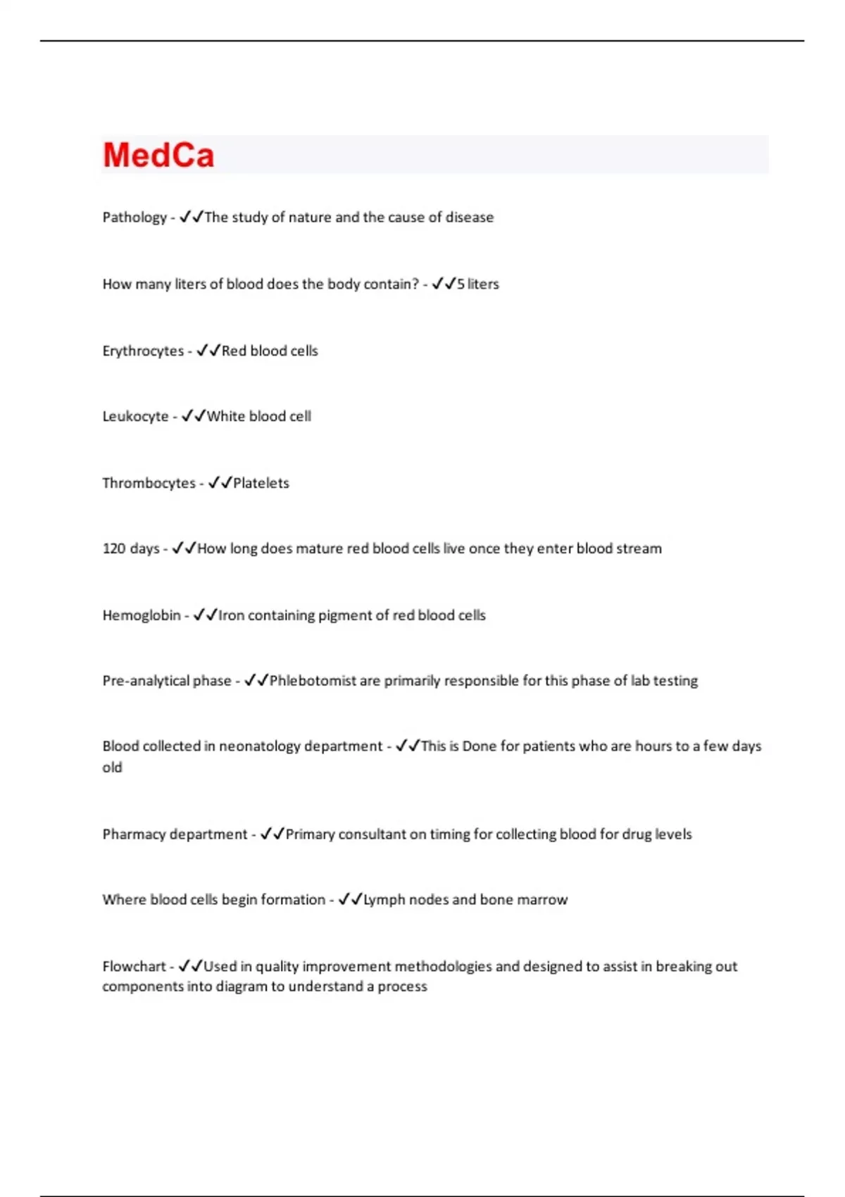 Pathology - The study of nature and the cause of disease How many liters of blood does the body contain? - 5 liters Erythrocytes - Red blood cells Leukocyte - White blood cell Thrombocytes - Platelets 120 days - How long does mature red blood cells live once they enter blood stream Hemoglobin - Iron containing pigment of red blood cells Pre-analytical phase - Phlebotomist are primarily responsible for this phase of lab testing Blood collected in neonatology department - This is Done for patients who are hours to a few days old Pharmacy department - Primary consultant on timing for collecting blood for drug levels Where blood cells begin formation - Lymph nodes and bone marrow Flowchart - Used in quality improvement methodologies and designed to assist in breaking out components into diagram to understand a processQuality improvement for specimen collection involve - -Phlebotomist technique -Recollection rates -Frequency of hematomas Pareto charts - Designed to assist in making bar charts that show frequency of problems