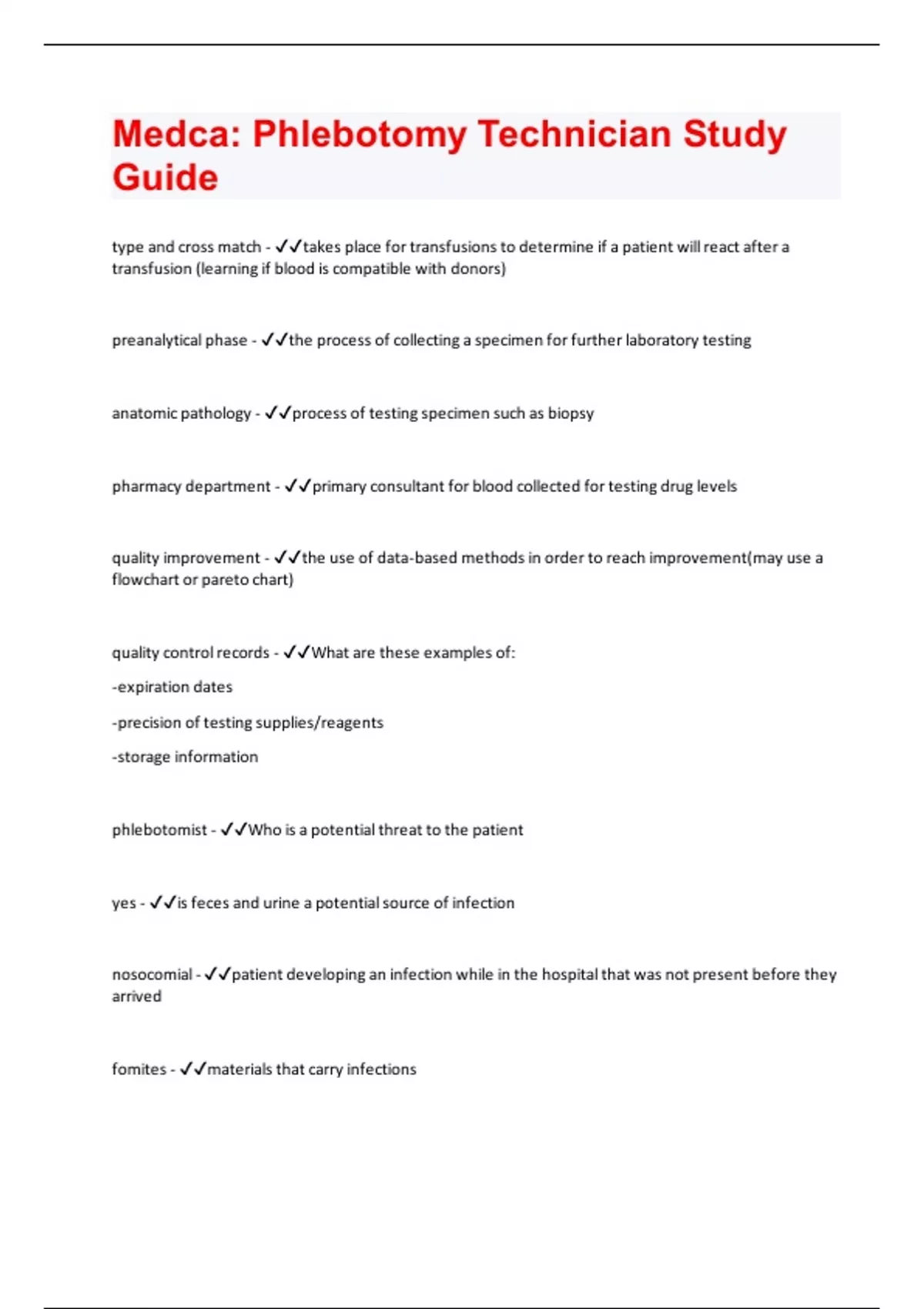 Medca: Phlebotomy Technician Study Guide Questions and Answers;(perfect guide for your final)