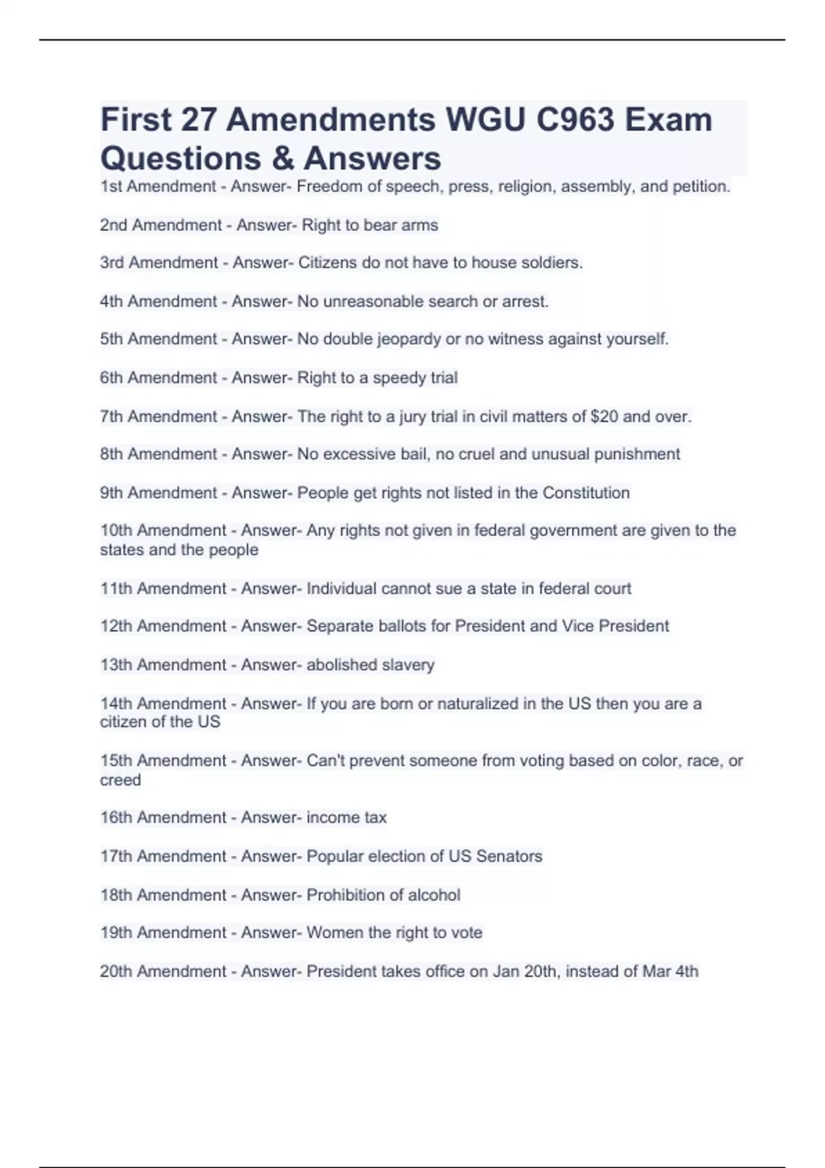First 27 Amendments WGU C963 Exam Questions & Answers